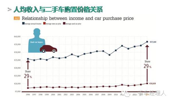 德国二手车消费占收入的比值十分稳定,无论人们的年均收入和二手车价格如何波动,它们之间的对比关系一直是在30%左右。也就是说,一个计划购车的用户,他的年收入是10万人民币,那么他会愿意花3万块钱去买一辆二手车。