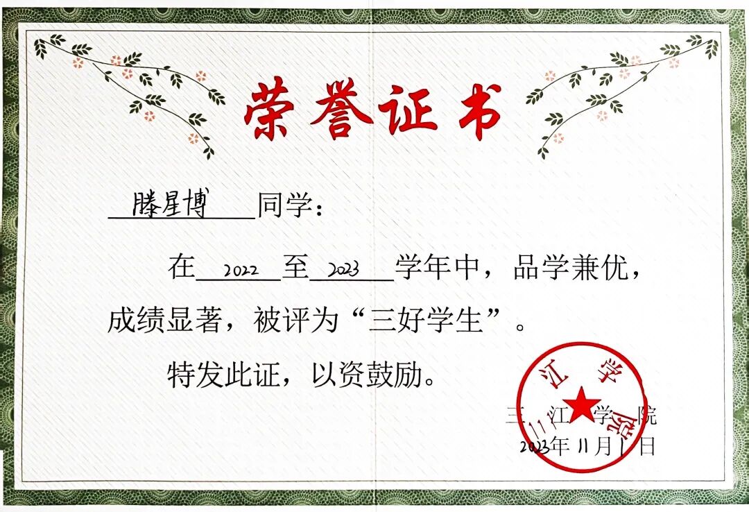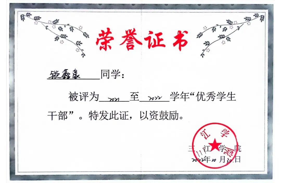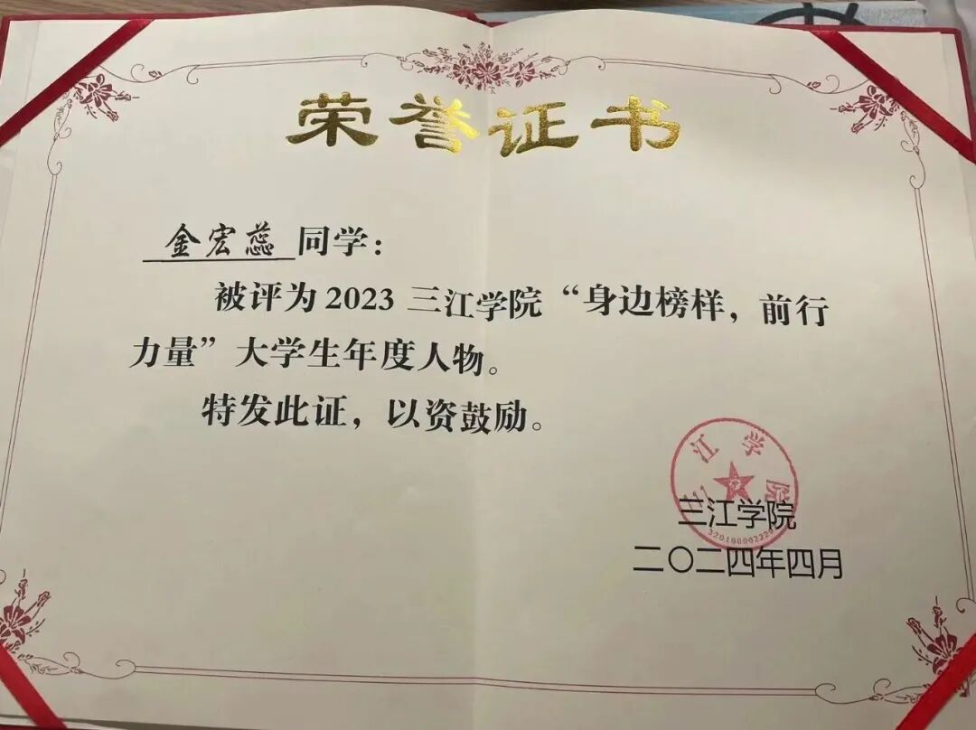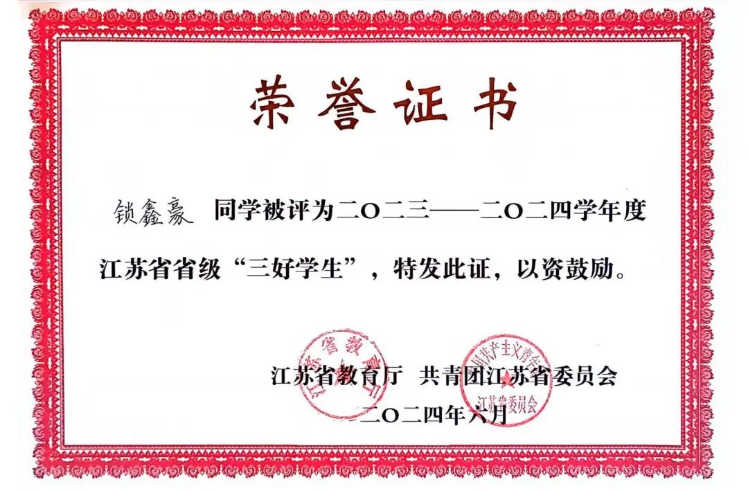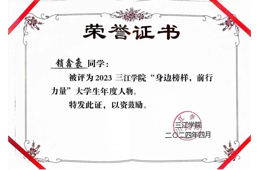 通过不断的积累和努力,他也成功获评2023年江苏省“三好学生”,2次国家励志奖学金和众多校级荣誉,如三江学院年度人物,三好学生,优秀学生干部和优秀团干部等。一路走来,锁鑫豪非常感谢老师和辅导员的关照,他们的教导和无微不至的关心,给予他很大的勇气和信心走下去,犹如是灰暗地带的一道光,引领他,激励他。