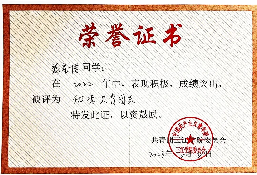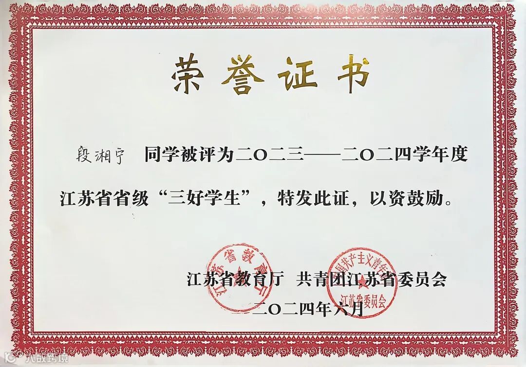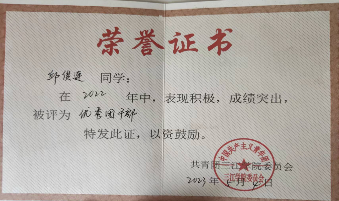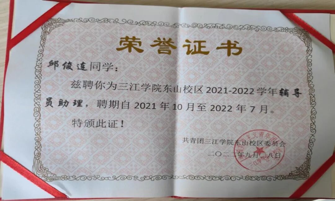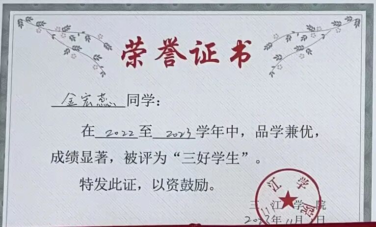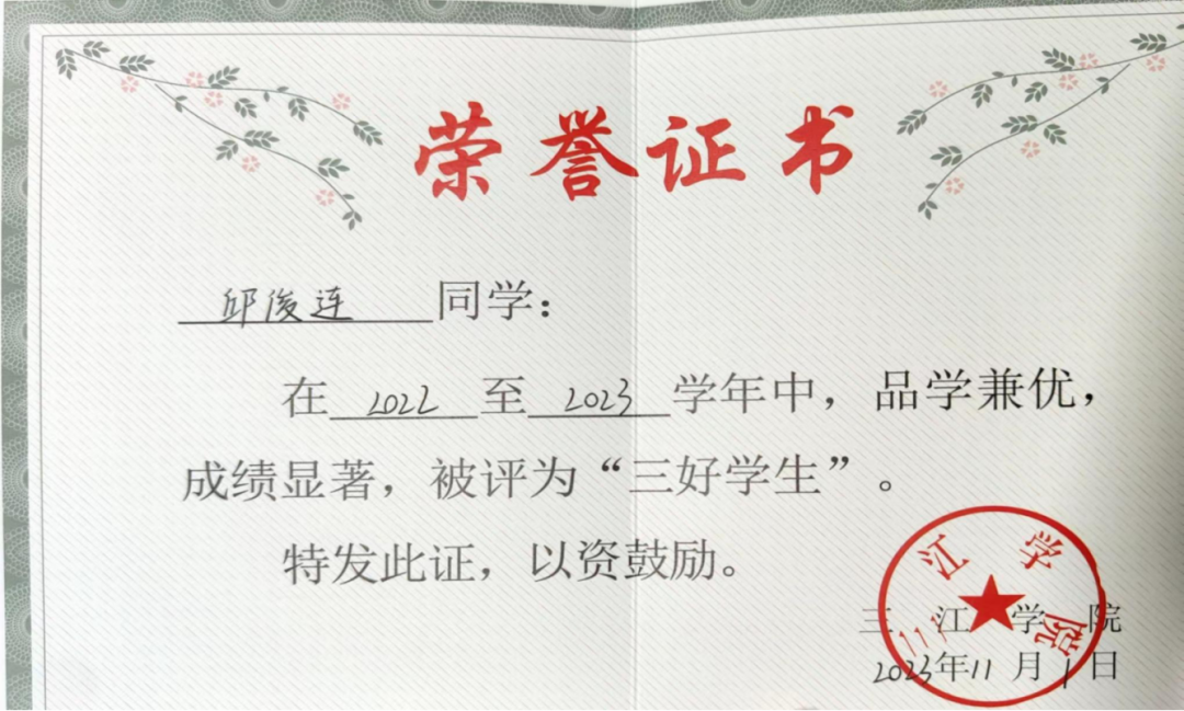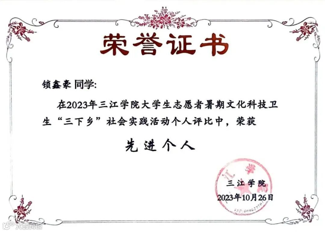 通过不断的积累和努力,他也成功获评2023年江苏省“三好学生”,2次国家励志奖学金和众多校级荣誉,如三江学院年度人物,三好学生,优秀学生干部和优秀团干部等。一路走来,锁鑫豪非常感谢老师和辅导员的关照,他们的教导和无微不至的关心,给予他很大的勇气和信心走下去,犹如是灰暗地带的一道光,引领他,激励他。