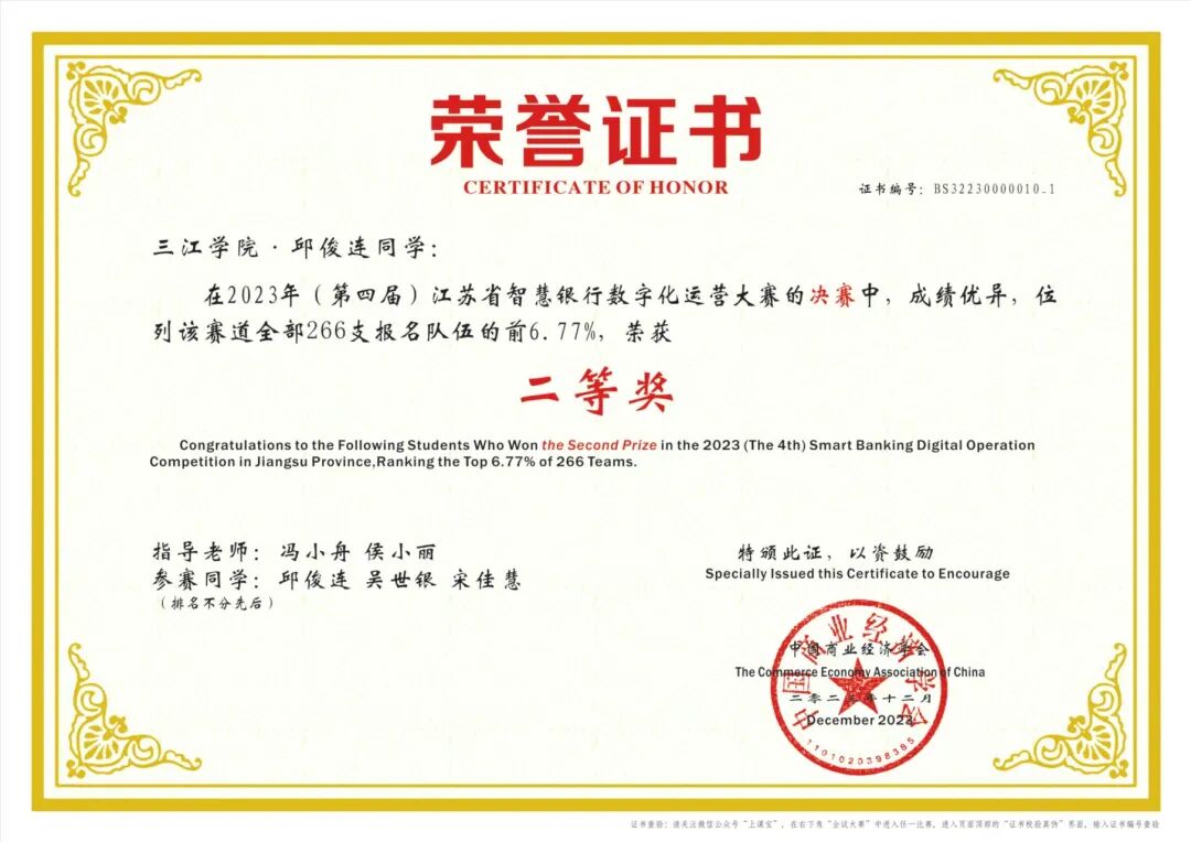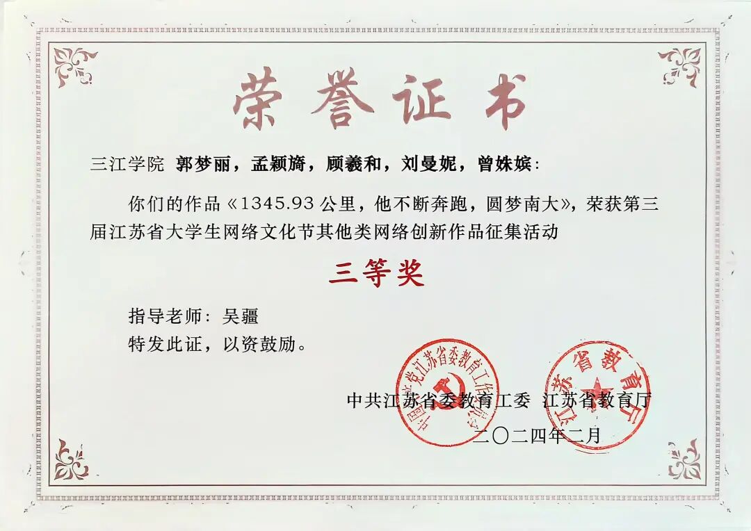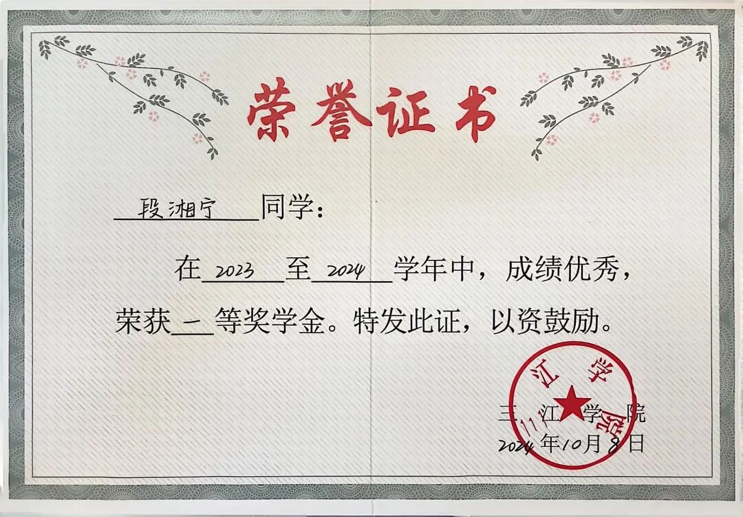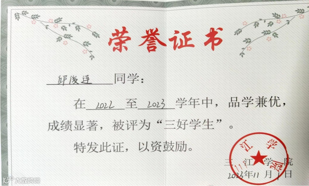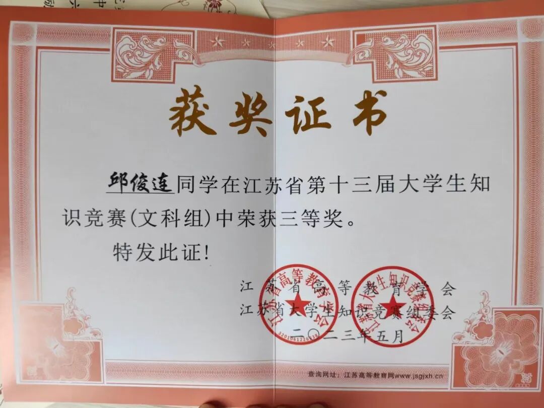 通过不断的积累和努力,他也成功获评2023年江苏省“三好学生”,2次国家励志奖学金和众多校级荣誉,如三江学院年度人物,三好学生,优秀学生干部和优秀团干部等。一路走来,锁鑫豪非常感谢老师和辅导员的关照,他们的教导和无微不至的关心,给予他很大的勇气和信心走下去,犹如是灰暗地带的一道光,引领他,激励他。