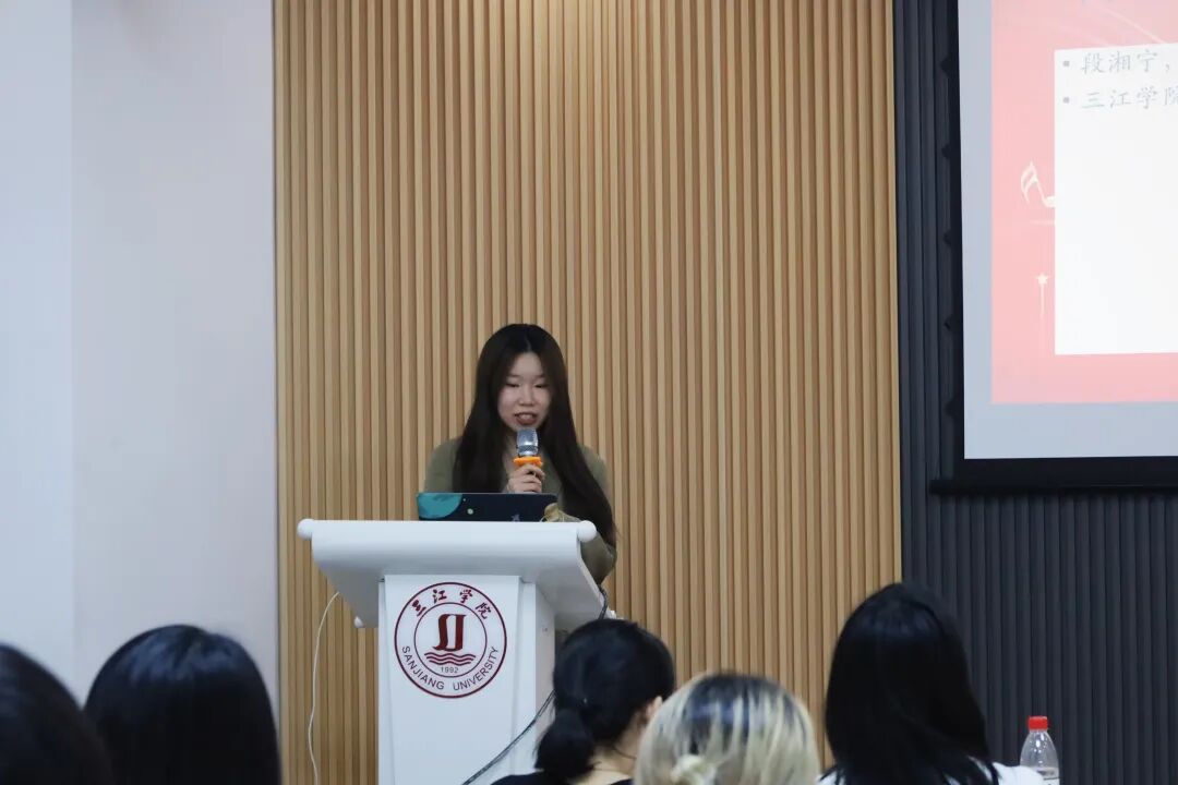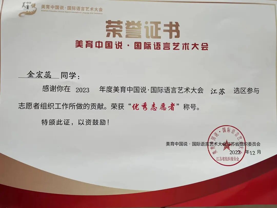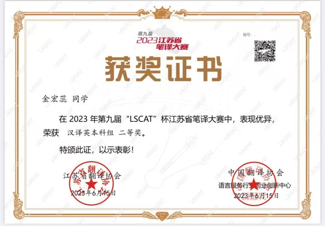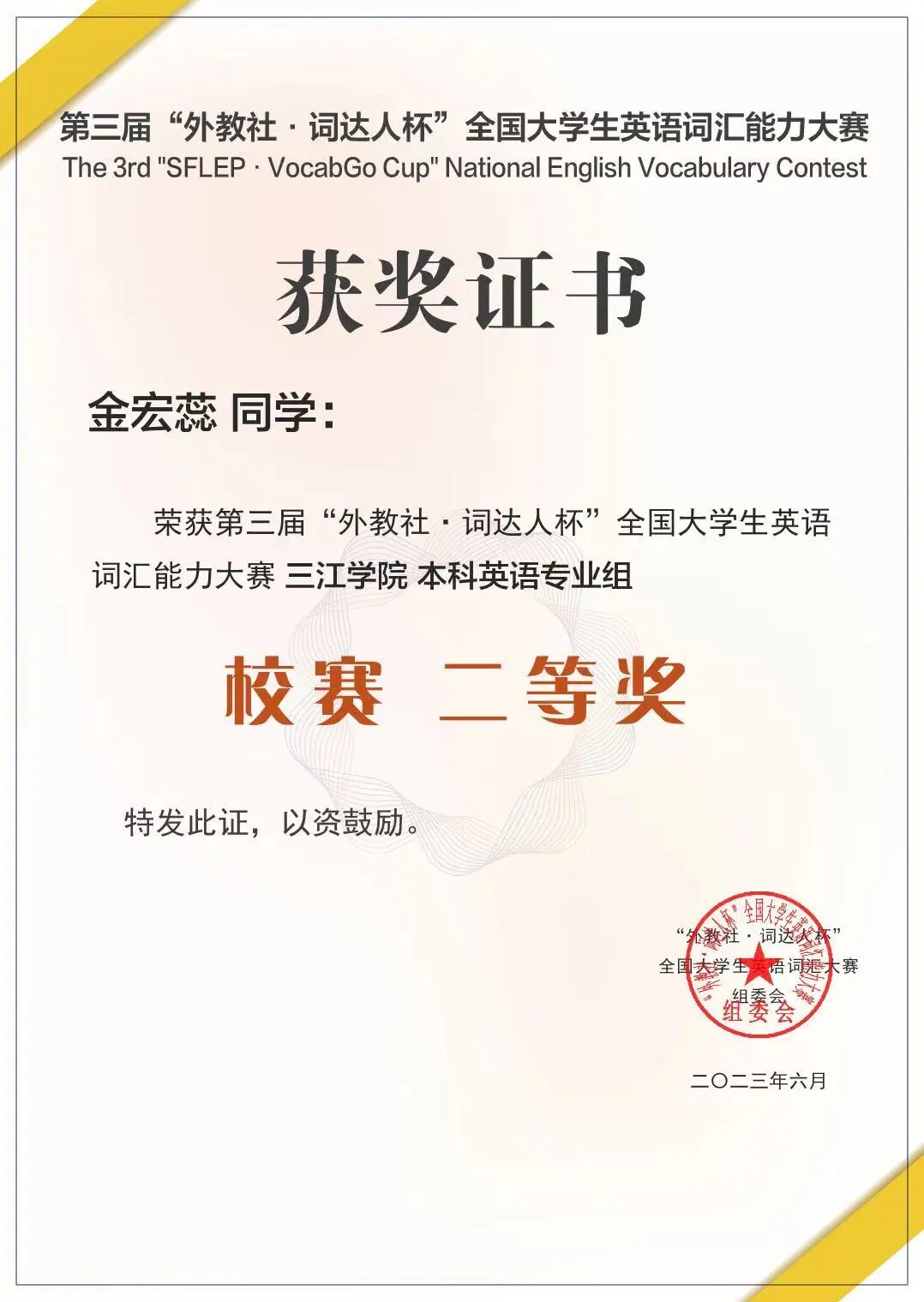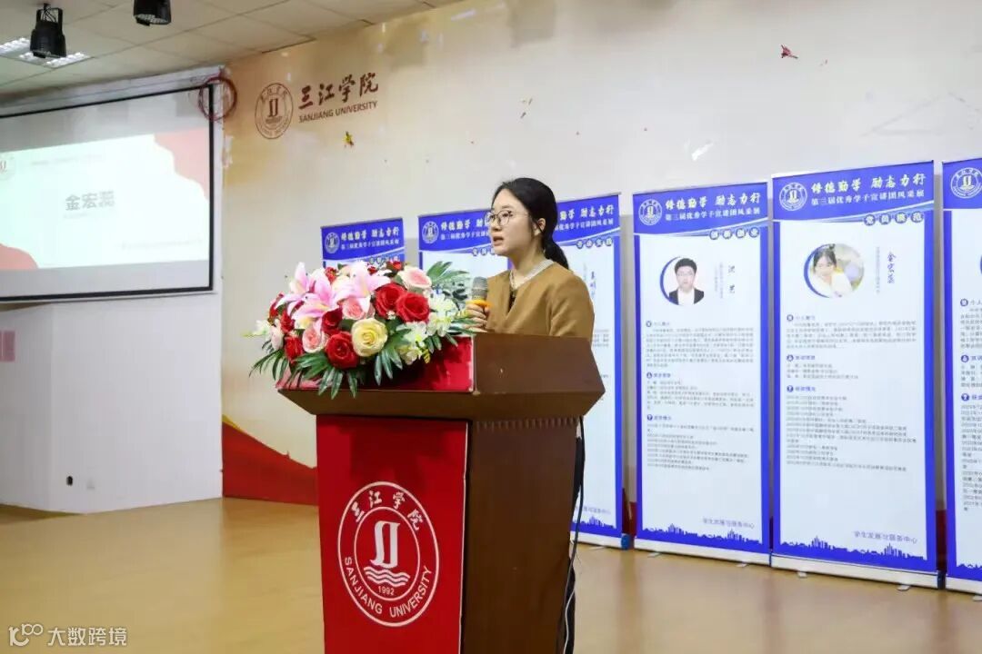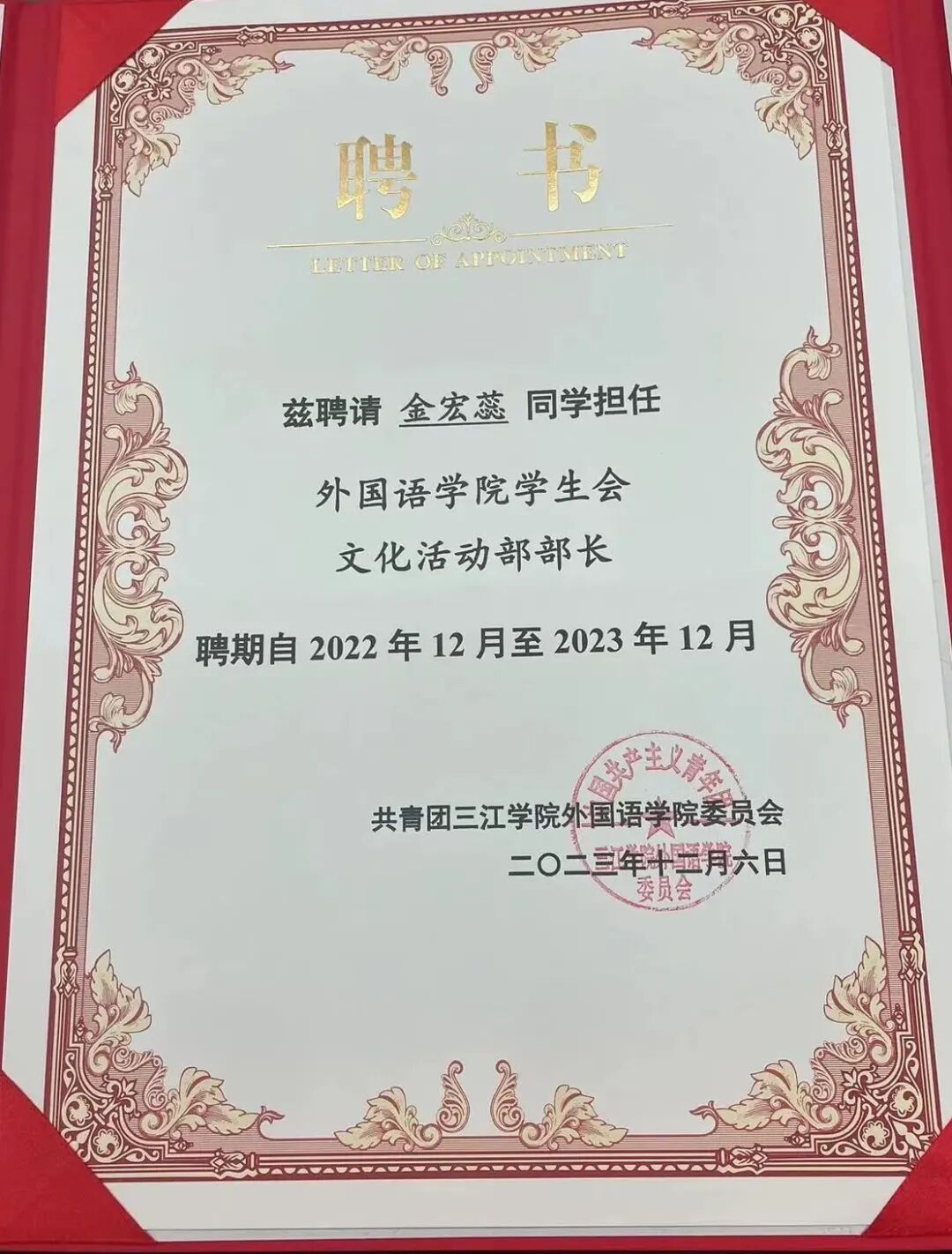 金宏蕊,女,中共党员,外国语学院英语专业2021级学生。曾任外国语学院学生会文化活动部负责人,12021011H班班长, 现任12021011D班班长。于2022年和2023年连续两年获得校“三好学生”、校“一等奖学金”,英语专业四级考试荣获“优秀”等级,第九届江苏省“LSCAT”笔译大赛获得二等奖和优胜奖,“外教社·词达人杯”校赛二等奖。她连续两年在“红色旅游资源的沉浸式体验开发模式研究”以及“优秀短视频推广助力大学生国际传播能力提升研究”创新创业训练计划项目中担任主持人,并且项目顺利立项。2022年12月,参与美育中国说江苏省组织委员会举办的志愿活动,获得美育中国说• 国际语言艺术大会“优秀志愿者”称号。2023年,协助外国语学院开展论文答辩工作,荣获“优秀小助教”。2024年成为三江学院第三届优秀学子宣讲团成员。