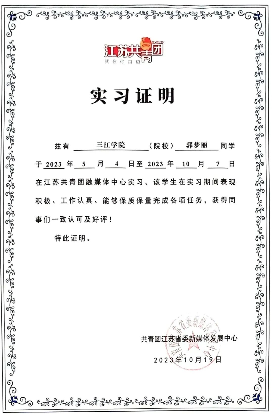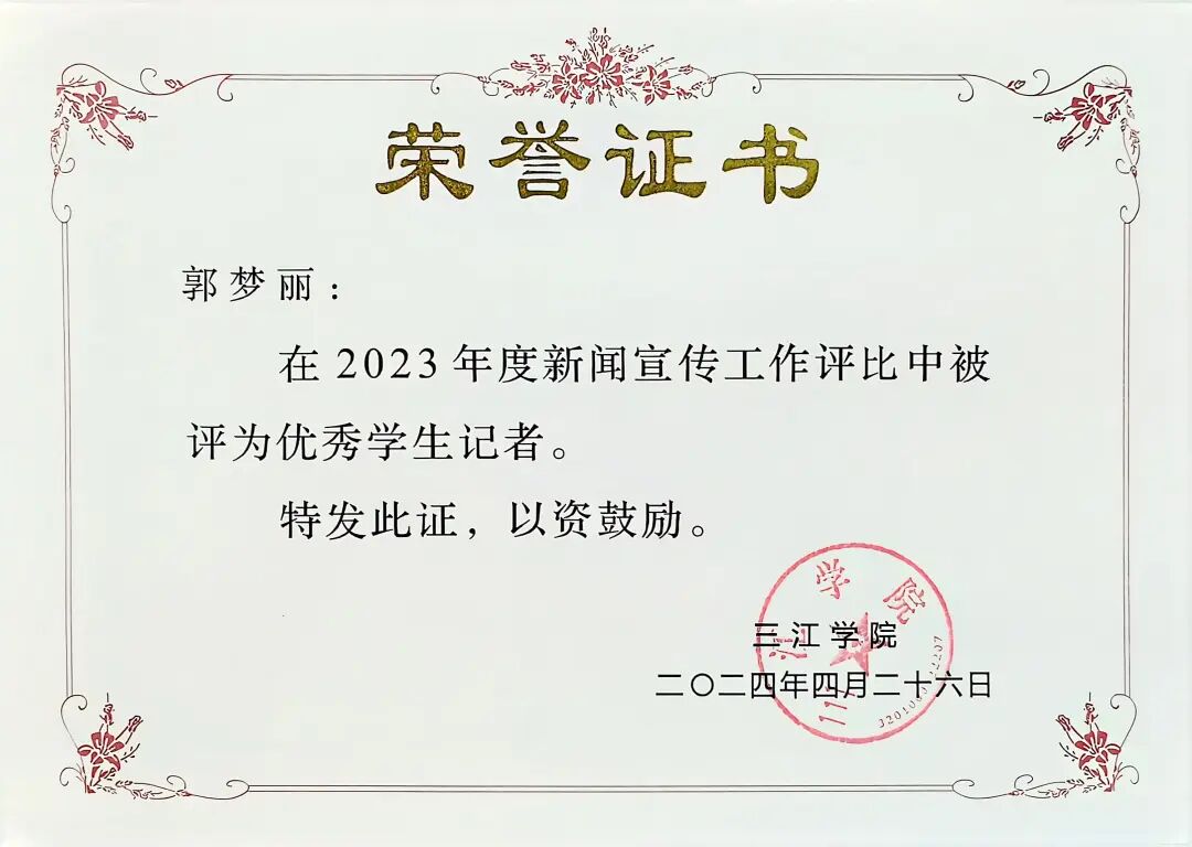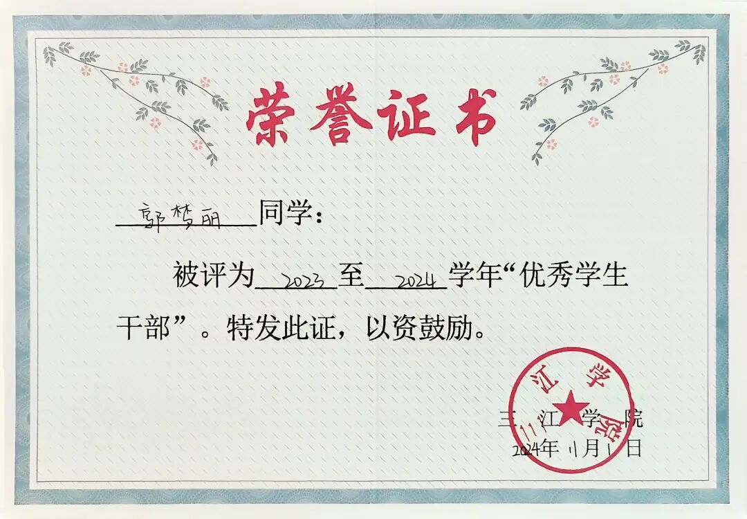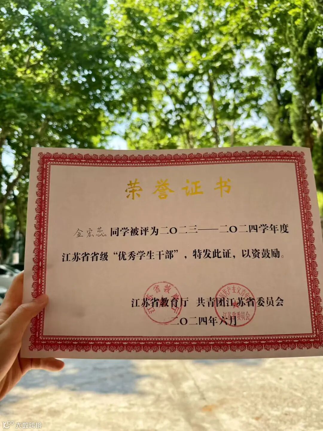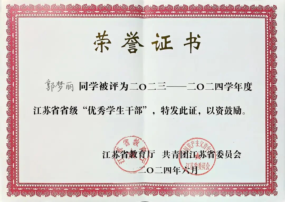 郭梦丽认为只有追求平衡、全面的发展,才能实现更美好的未来。因此,除了学习竞赛、实践志愿外,作为学生干部的她,在校、院等部门履职期间,积极参与并认真完成各项工作。曾获江苏省优秀学生干部、校优秀学生干部、优秀学生记者等多项荣誉。这些活动,在潜移默化中提高了郭梦丽的组织策划、领导协调和团队协作能力,她非常感谢一路走来的所有老师们给予她展示的舞台与机会。