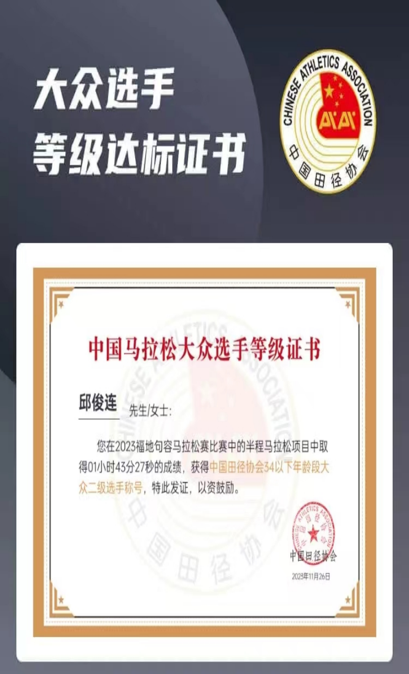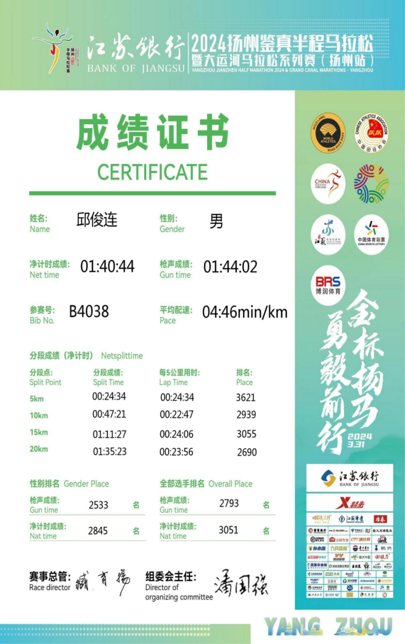 邱俊连参加扬州鉴真半程马拉松获得的证书