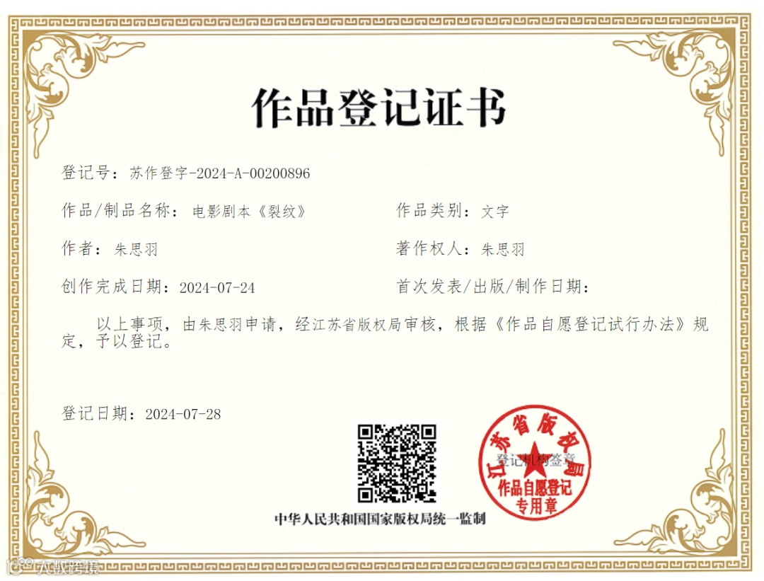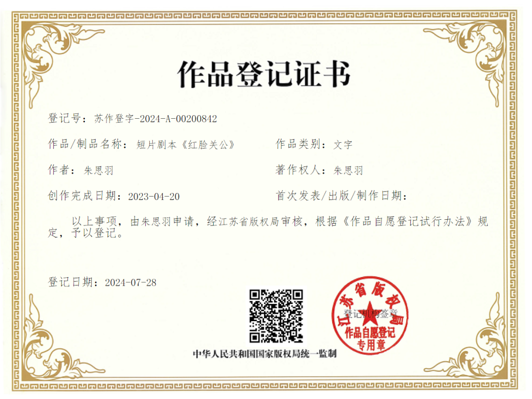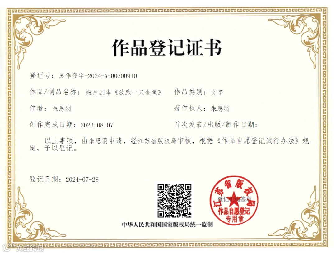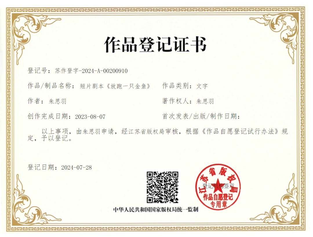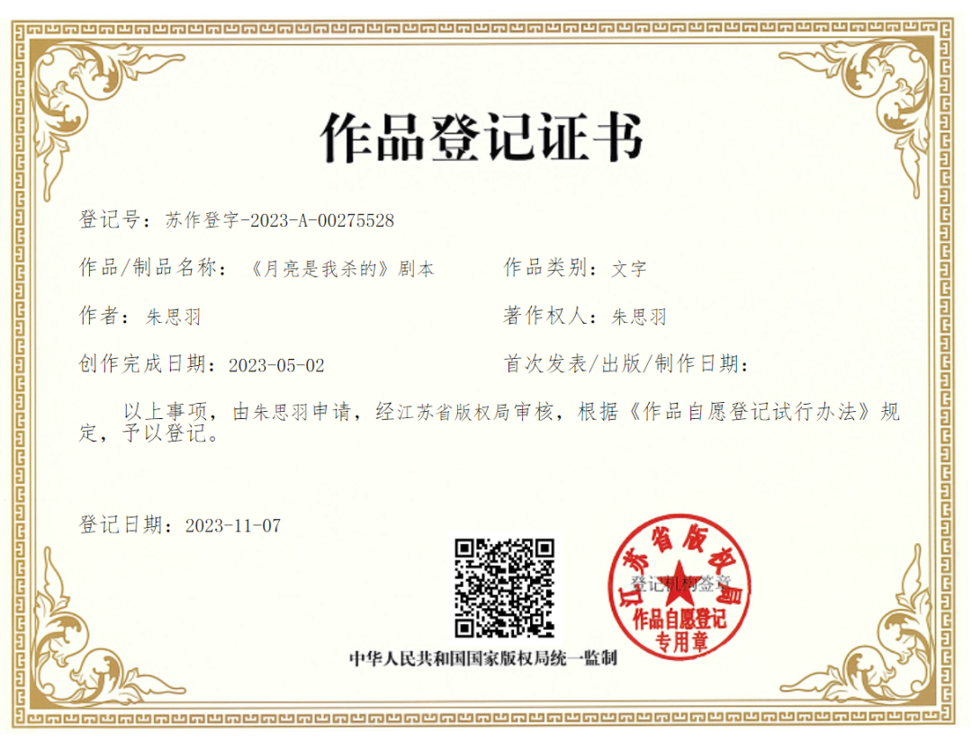 学以致用,版权意识要先行。竞赛中的获奖作品她也依次在江苏版权局登记,累计登记作品 10余项。其中包含了电影剧本《花瓶裂纹》、短片剧本《月亮是我杀的》,戏曲剧本《红脸关公》等。