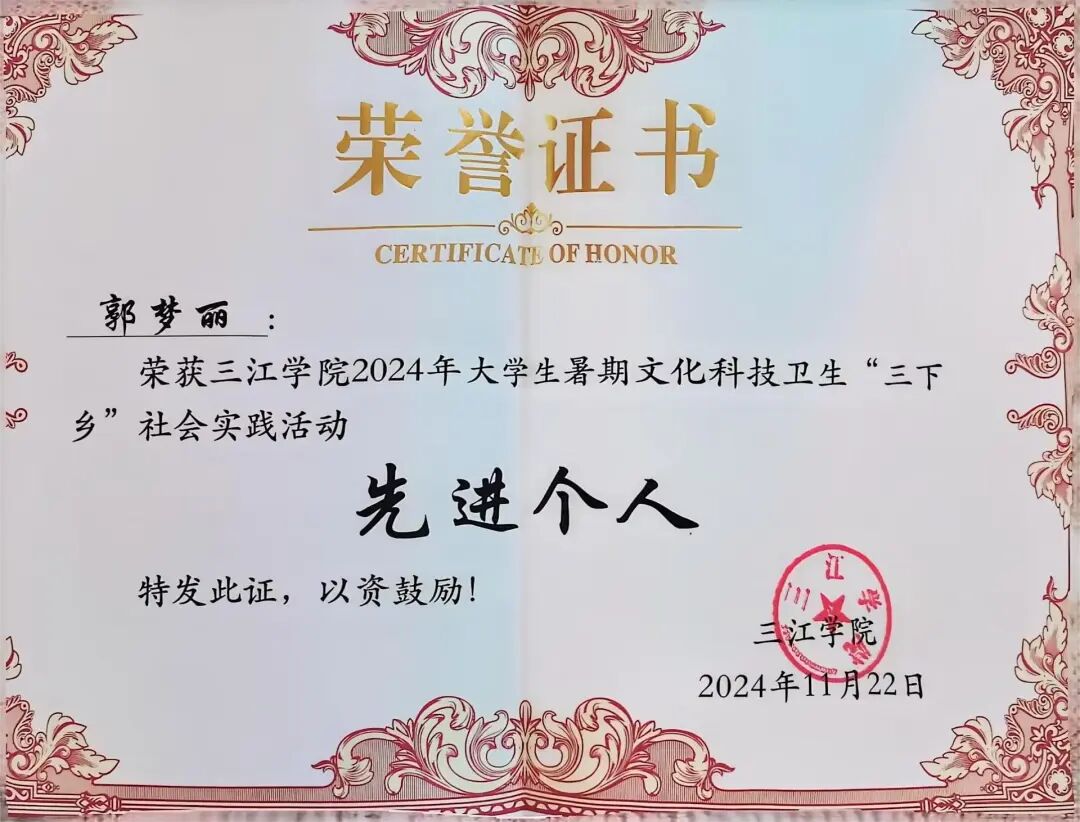 “仁者爱人,有礼者敬人。爱人者,人恒爱之;敬人者,人恒敬之。”郭梦丽积极弘扬中国共产党人的精神谱系,传承红色基因,踊跃参与各类社会实践和志愿服务。在校内连续3年参加暑期三下乡社会实践活动,连续2年担任主要负责人,连续2年获校三下乡先进个人。因每次的实践过程计划周全、统筹合理、成果丰硕,活动曾被中国日报、江苏共青团、新浪微博等媒体报道,她所带领的团队荣获“优秀实践团队”“优秀实践报告”等荣誉。不论是南京溧水、扬州仪征,还是安徽亳州,三年的社会实践经历,都让郭梦丽走出校园、走向社会、接触社会、了解社会,在实际生活中用所学助力乡村振兴与社会发展,开拓视野的同时增长了个人才干。
