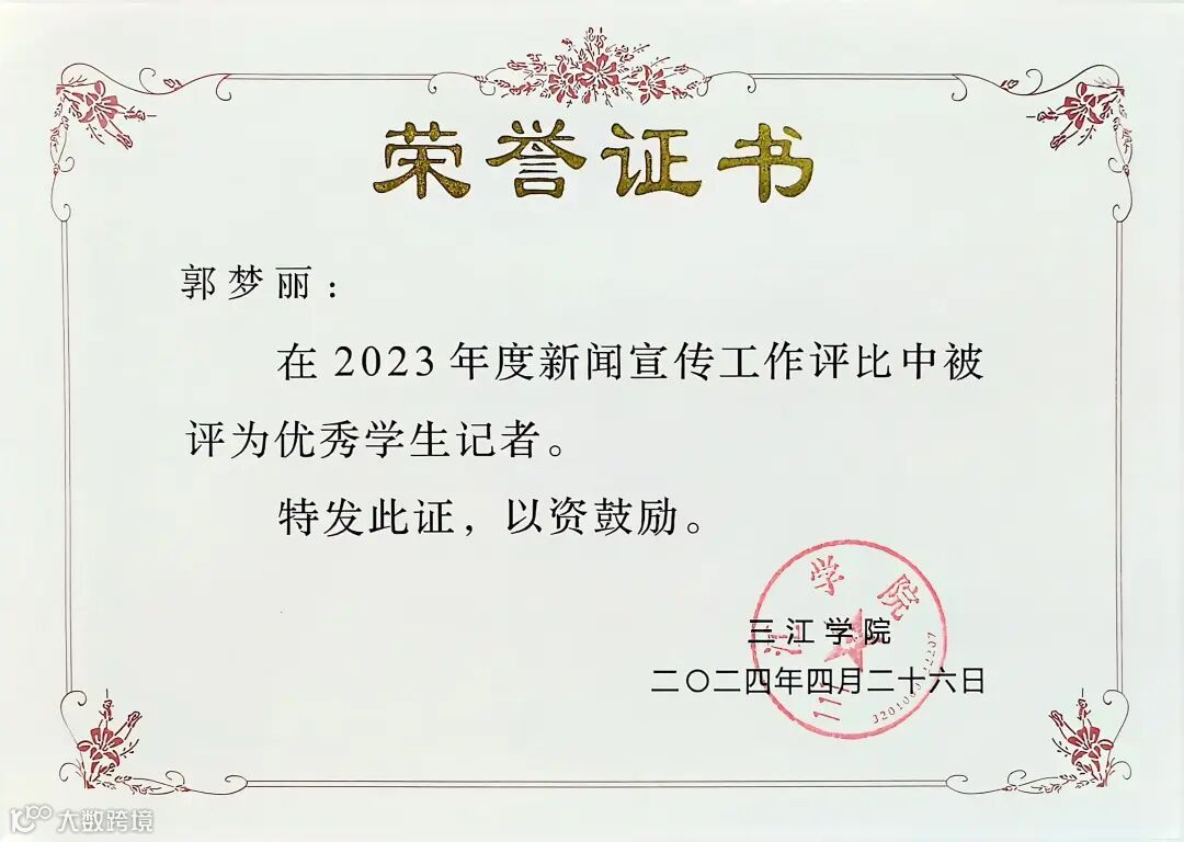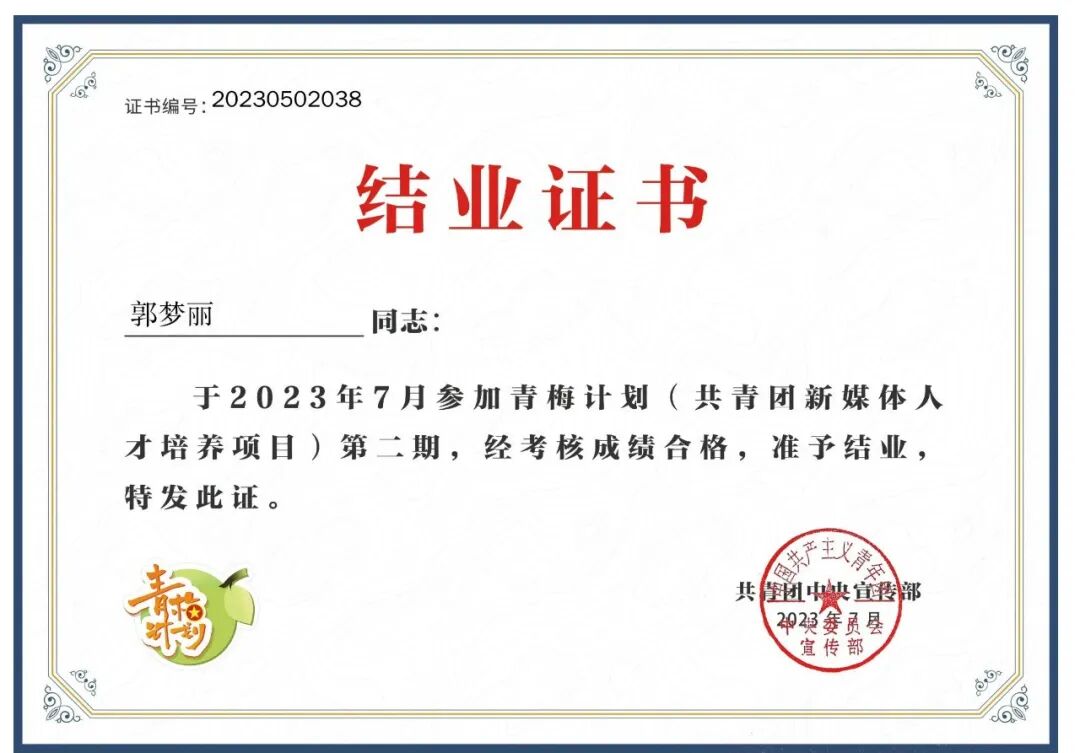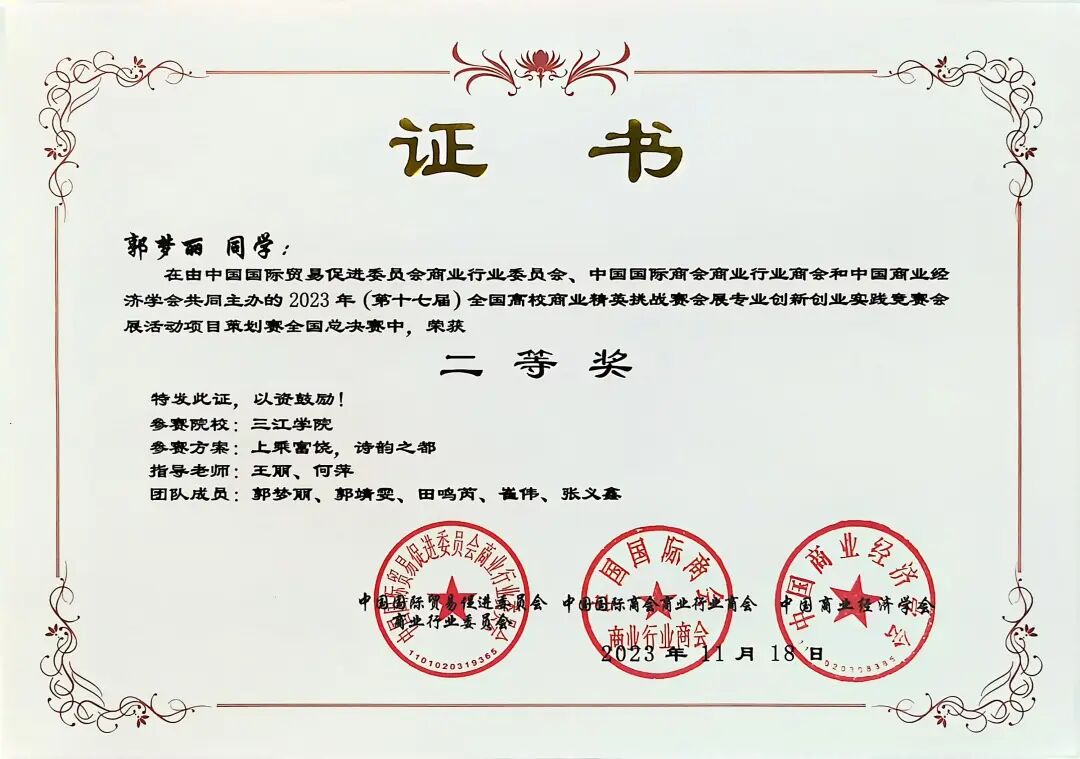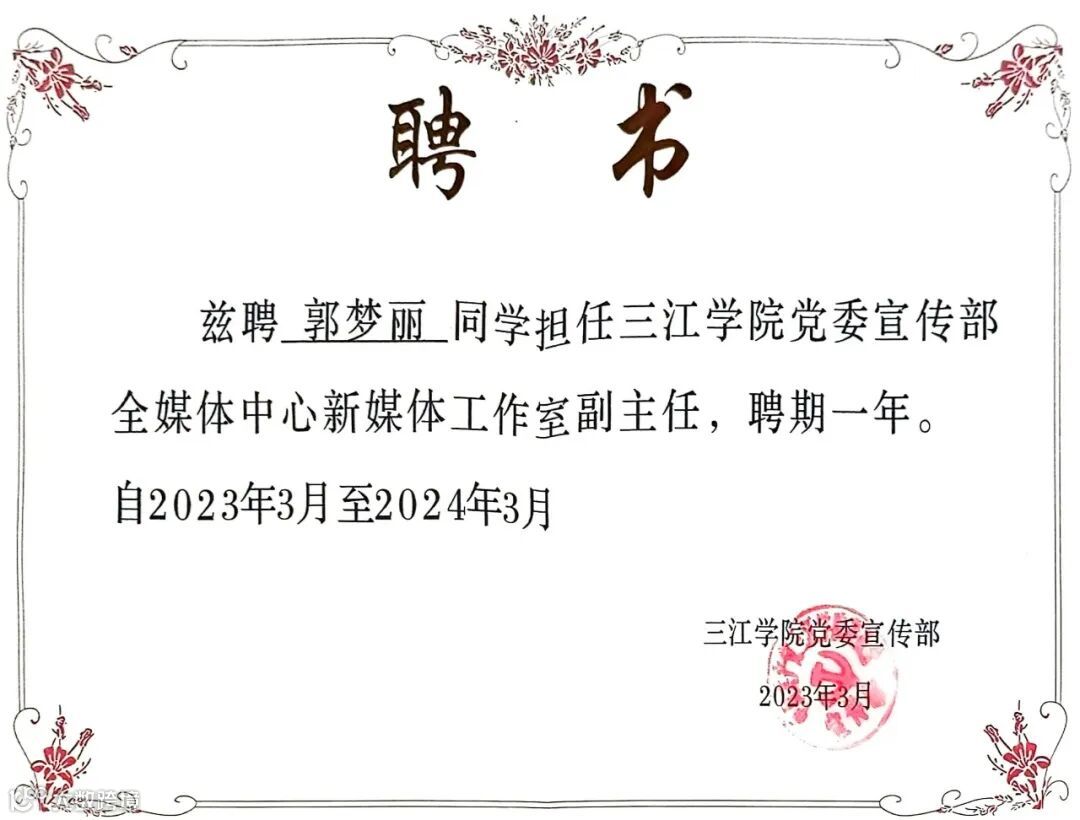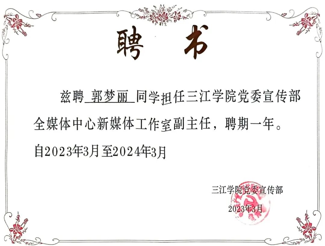 “博学之,审问之,慎思之,明辨之,笃行之。”郭梦丽始终牢记学习是学生的第一要务,因此,她始终以高标准、严要求督促自己。坚持在课堂上认真听讲,勤做笔记,积极思考。她连续两年位列专业第一,专业核心课程均分达91分,曾多次获得“三好学生”“一等奖学金”等荣誉。除了专业学习,她坚持在其他领域积极探索,现已取得SYB职业资格、会展职业经理人资质等,并于2023年完成共青团中央宣传部青梅计划新媒体人才培养项目。