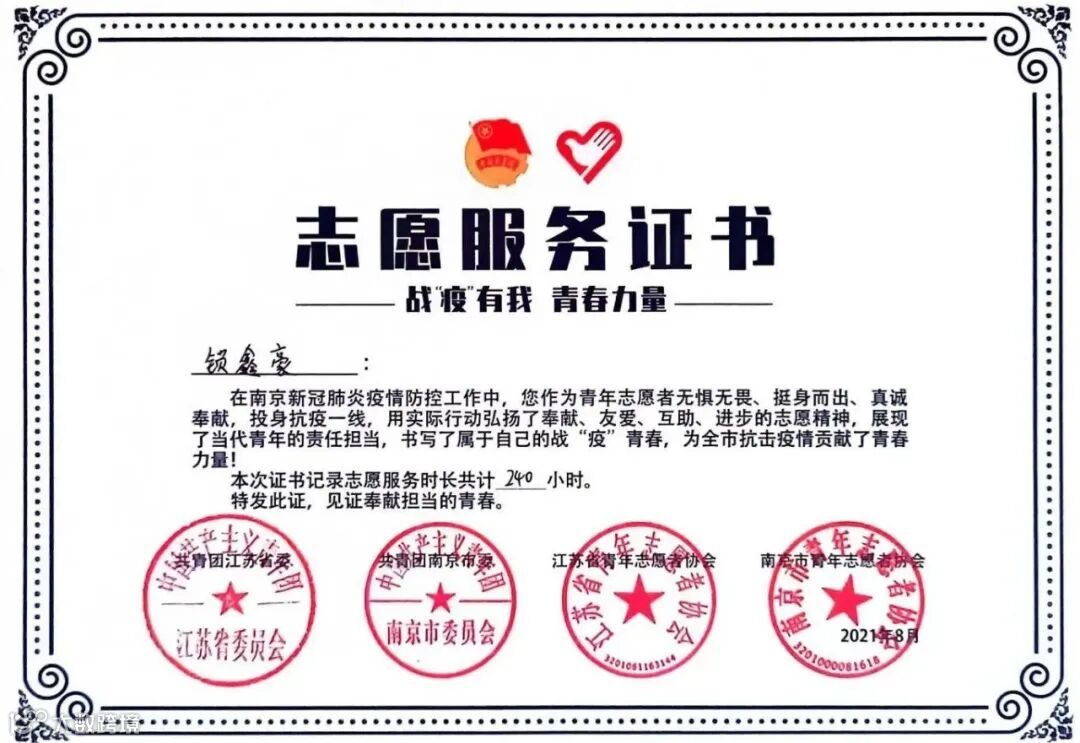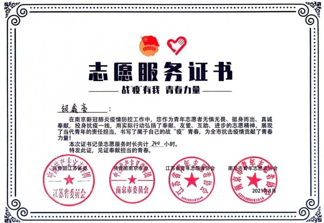 在疫情的寒假期间,他主动参与抗击疫情志愿服务,并坚守道路主干道的夜班工作,这往往需要忙碌一整晚,但他仍然坚持了一个月的时间,累计志愿服务时长240小时。