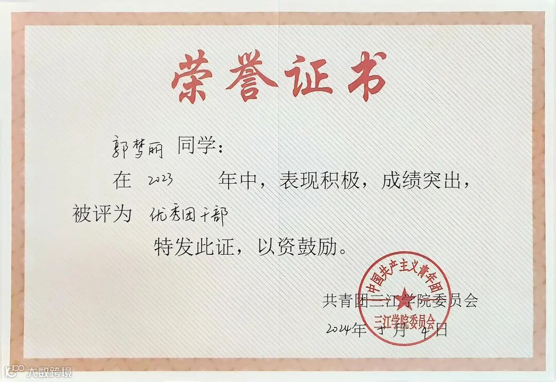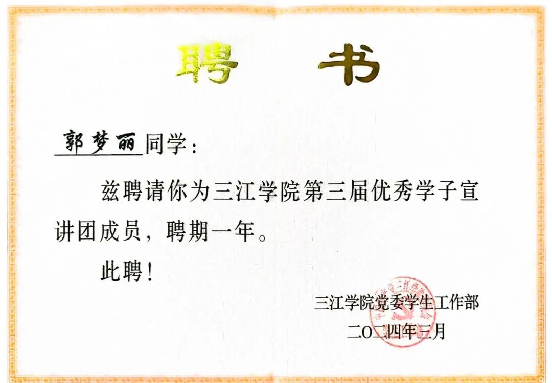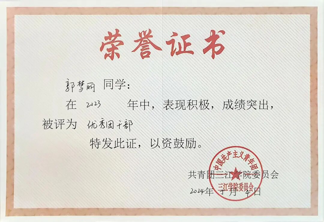 向下扎根,向上生长!一路走来,郭梦丽非常感谢老师们的鼓励和支持、同学们的陪伴。专业学习与竞赛方面,王丽院长不仅教会了她“细节决定成败”,治学一定要严谨,还在每次竞赛、大创的指导中为她提供了耐心细致的指导与建议。辅导员王丽老师总能在生活中很多时刻为郭梦丽指点迷津,帮她指明前进的方向,促其成长。未来,她将继续以奋斗的姿态,以拼搏的行动,怀抱对学术的热爱与对社会的责任感,迎接到来的每一个挑战!
