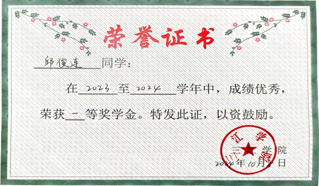 谈及国家奖学金,邱俊连说这是他大一时就设立下的目标。那时的他满怀憧憬地开启自己的大学生活,入学时在学校公众号上看到了很多优秀的学长学姐,榜样的力量在他的心里种下了一颗种子,让他坚定了要在奋斗与奉献中追寻青春的意义。他说就算最后不一定能够获得这么高的荣誉,这一路走来也必然充实。