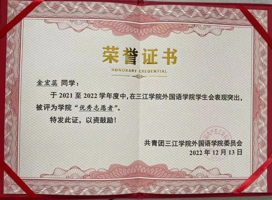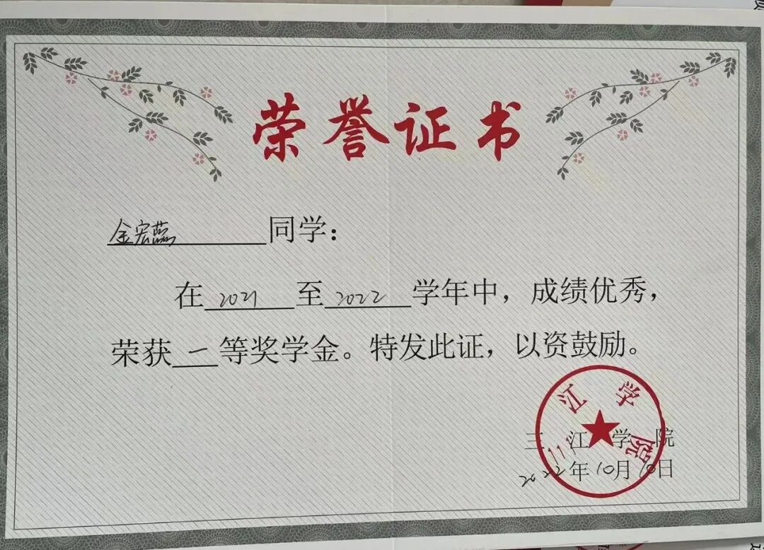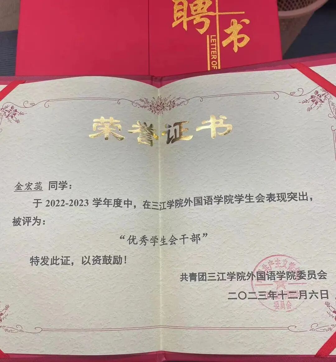 在学习和实践的赛道上,金宏蕊也不逞多让,给自己交出了优秀的答卷。她的成绩始终保持在年级前3%,她认为,比赛和实践是另一种方式的学习,玉汝于成,功不唐捐。金宏蕊用汗水和岁月,浇灌出了独属于自己的人生之花。不仅在党务实践活动中踏实肯干,在学习之中,金宏蕊也严于律己,一纸纸荣誉证书,恰是她日积月累的证明,让她努力的汗水折射出光芒。