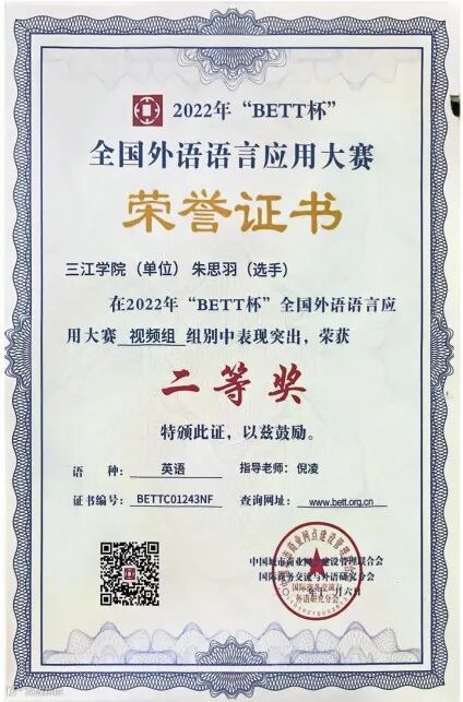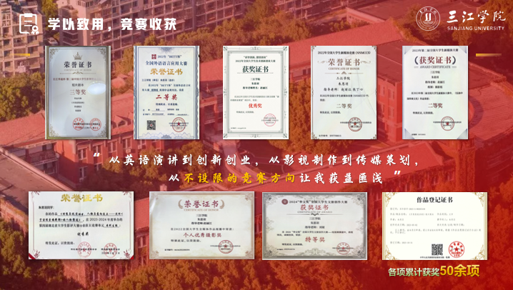 滴水成渊,厚积才能薄发。广播电视编导是一个综合性很强的专业,如何更好的将课堂所学知识融入专业实践学习里,从大一开始朱思羽便积极投身于各类竞赛,目前累计获奖证书超50张。其中包括英语演讲、创新创业、知识竞赛、影视制作、传媒策划等方面。不给自己设限,尽量多而全面的参与各级竞赛让她收获满满,受益匪浅。