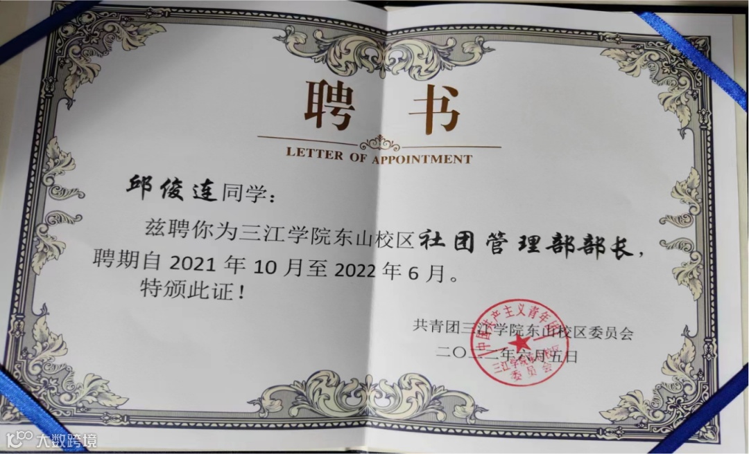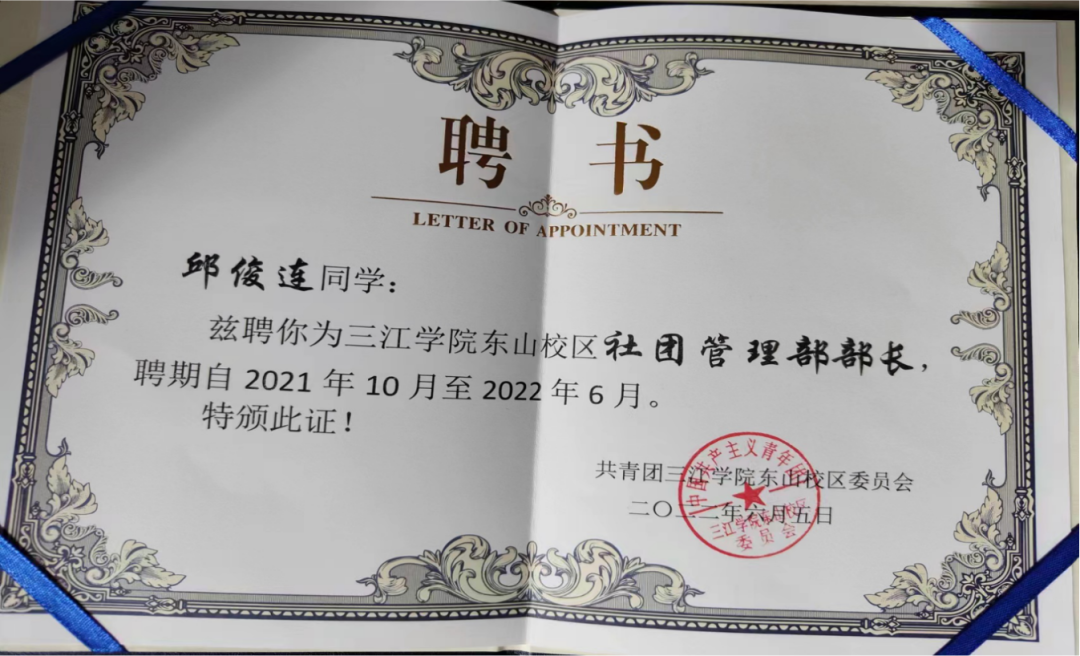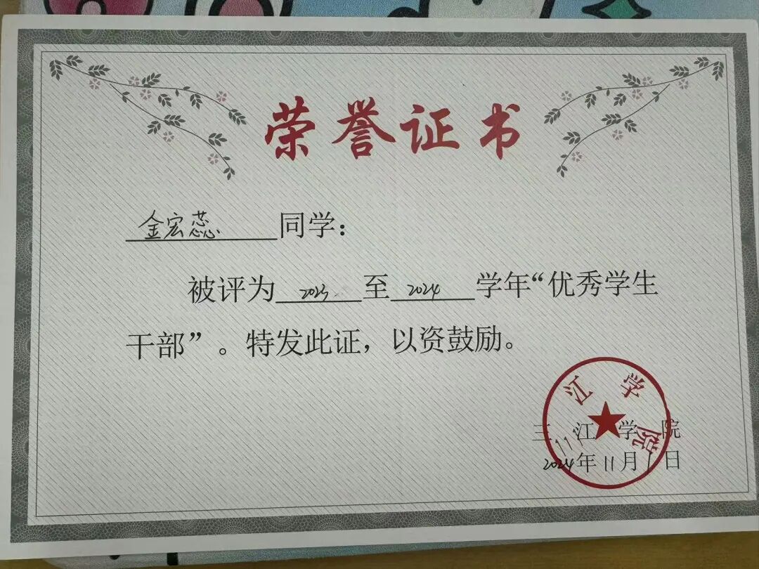 此外,他在土木工程学院学生会任职两年,先担任综合事务部负责人,主要负责协助各部门开展工作。后担任轮值主席,负责过推文制作,组织活动和开展学生会会议。期间,他也是党务督察小组,三江学院第三届优秀学子宣讲团的一员,他在其中不断发挥积极作用,鼓舞身边的同学一同进取。