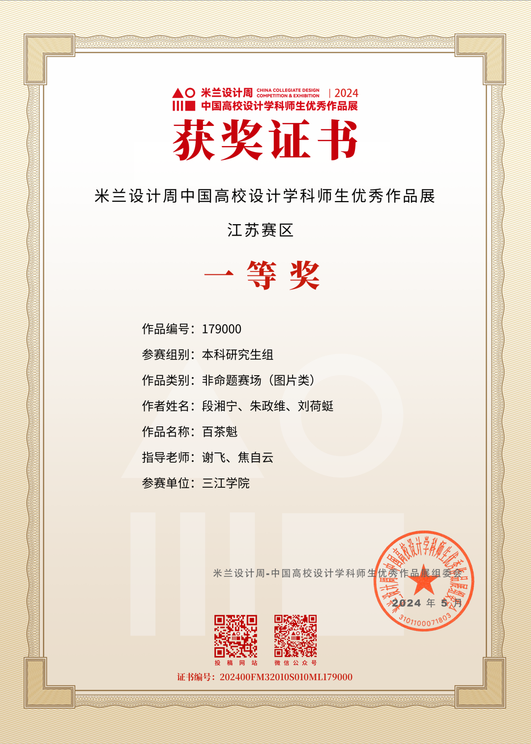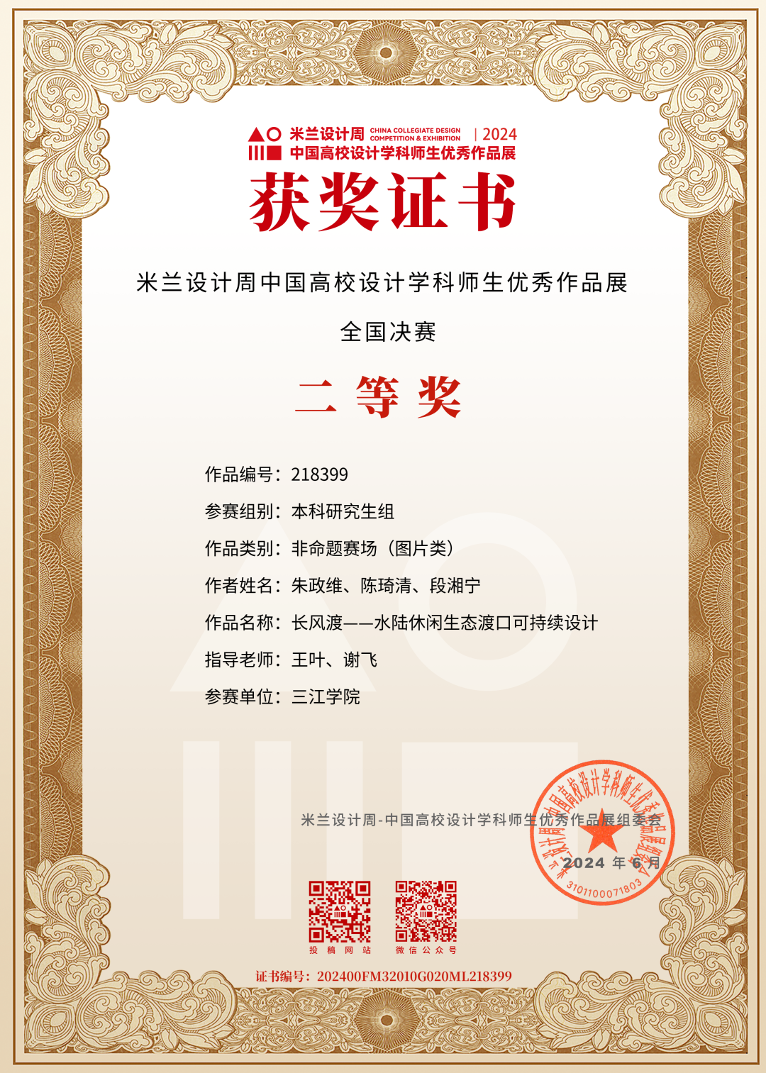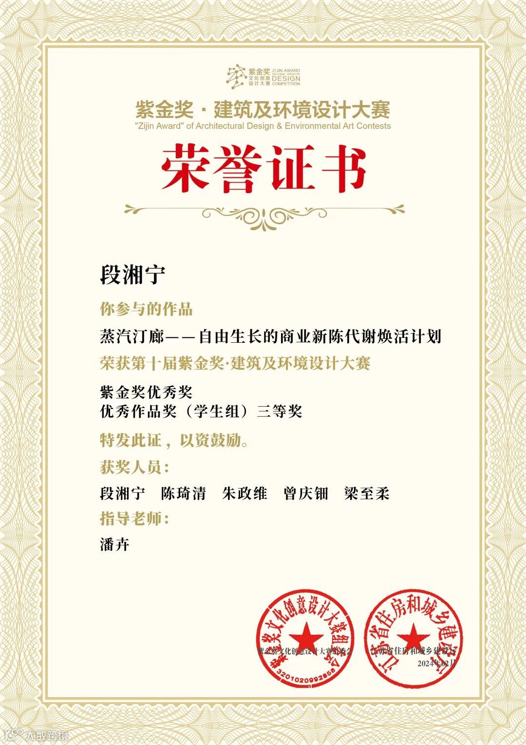 在学科竞赛上,段湘宁还经常与同学朋友组队,以赛促学。她认为团队磨合是团队合作中的不小障碍,每个成员有着不同的思维方式和个人风格,在设计理念上难免有所差异,作为组长的她经常作为粘合剂,组织成员们进行多次沟通。经过多次讨论,融合各方优点,敲定最终理想的建筑方案,与团队成员们一起获得最后的胜利。段湘宁团队的作品获第八届米兰设计周全国决赛二等奖,第八届米兰设计周江苏省一等奖,第十届紫金奖三等奖等优异的成绩。