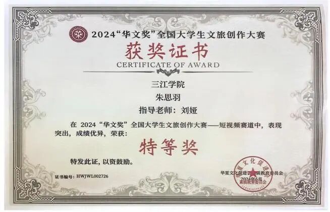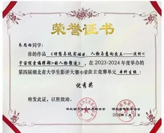 荣誉来之不易,更宝贵的是经历。从幕后的默默耕耘到站在台前代表发言,年少的她在一段段经历里看见了更大的世界。朱思羽曾参加了长江华晟杯·第二届中国大学生影视剧本大赛创作交流会,并作为最年轻的获奖者代表进行发言。也曾在第四届湖北省大学生影评大赛她荣获本科组优秀奖,并参与了由湖北省电影家协会与湖北文联举办的对话青年圆桌论坛,同年八月,她入选了第四届线上影视培训班成员。
