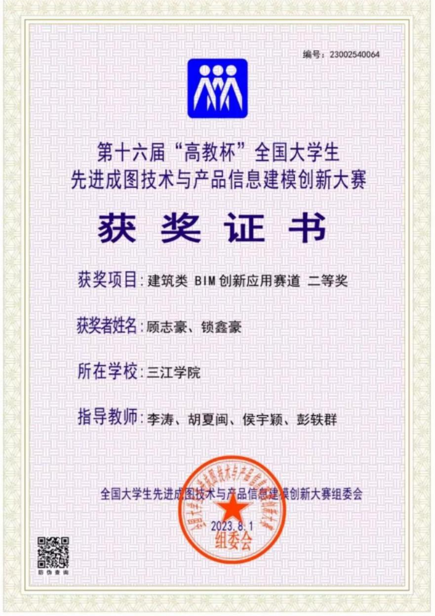 在学科竞赛上,锁鑫豪坚持学习建模理论以及建模软件操作,提升识图能力和建模速度,兴趣使然,促使他在该领域收获颇多,也荣获许多奖项。他深知拓展专业技能的重要性,因此他积极参加建筑信息模型技术员青年集训营并成功结业,同时自学品茗的三维建模软件和脚手架与模板制作,并自学有关钢筋制作的有关知识,成功通过了建筑信息模型BIM职业技能等级初级建筑方向和中级结构方向的考核。通过对相关专业知识的细致学习和软件的熟悉,他在第十届全国高校BIM毕业设计创新大赛中成功获得三等奖。