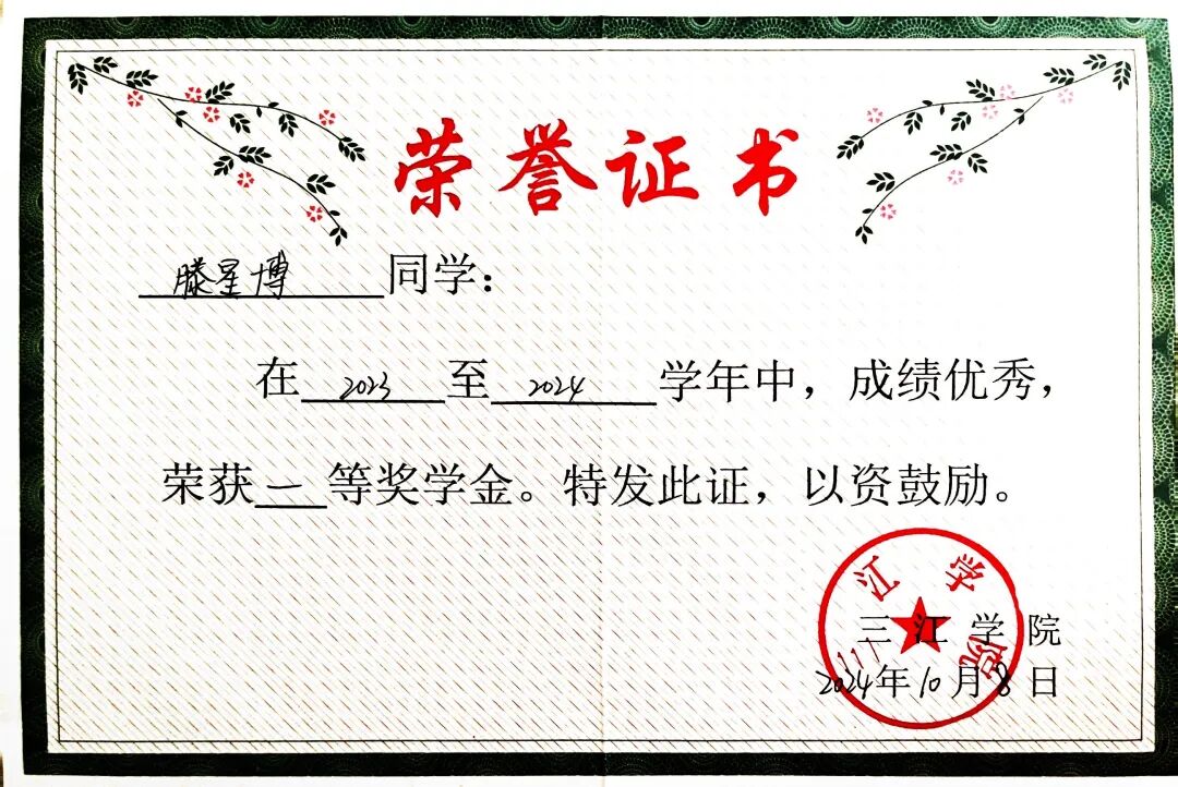 学习上,他注重方法与态度,认真对待每一门课程。只要沉下心去做,总会有收获。他积极与专业老师沟通,循循渐进,反复吸收。获国奖后,滕星博感慨万千,他表示大家都特别的优秀,所以他把这份荣誉当作一个警钟提醒自已,在未来面对工作或者生活的时候也要积极进取,脚踏实地走好每一步,做好每一件事。这荣誉于他,是过往努力的勋章,亦是未来前行的号角。