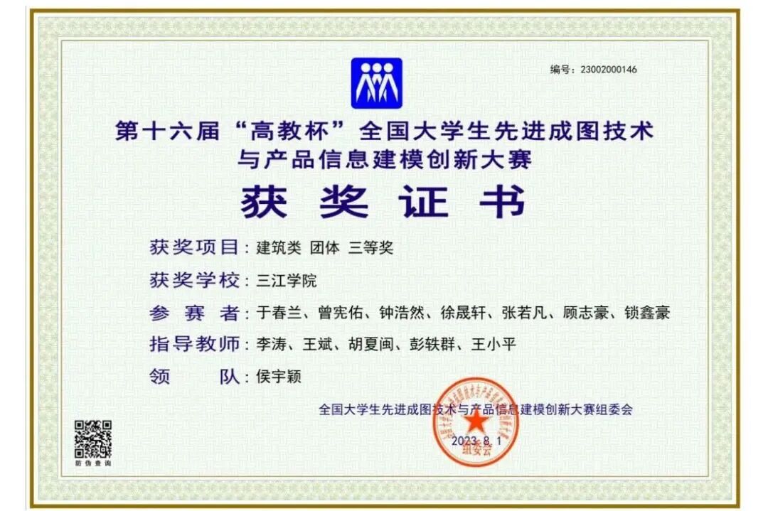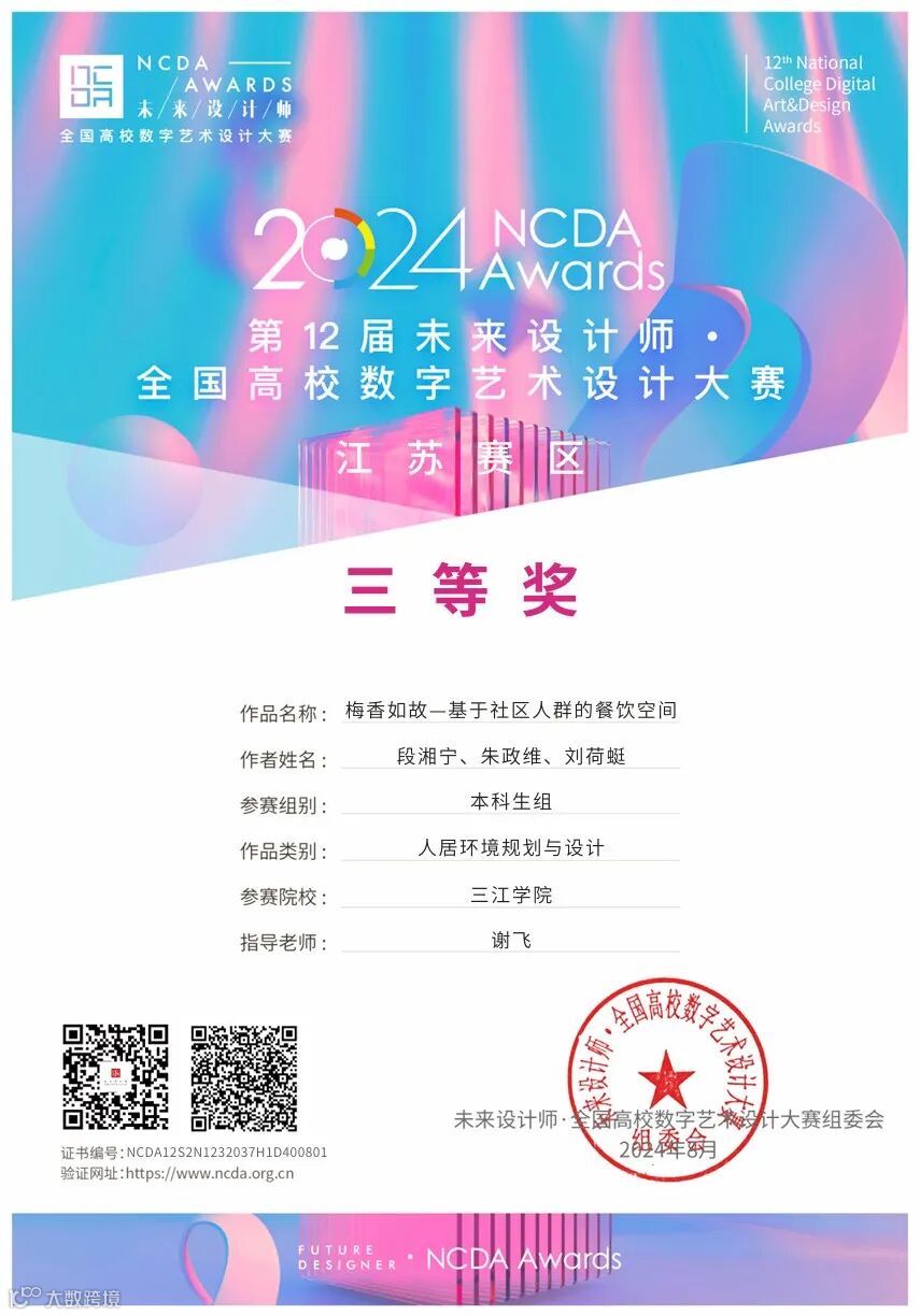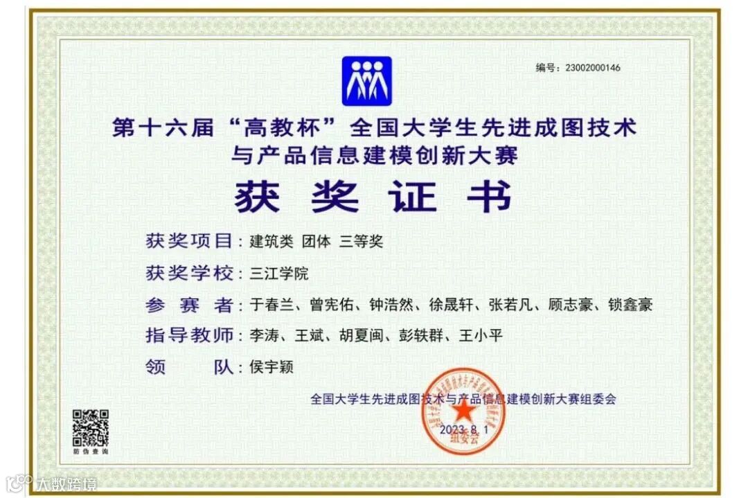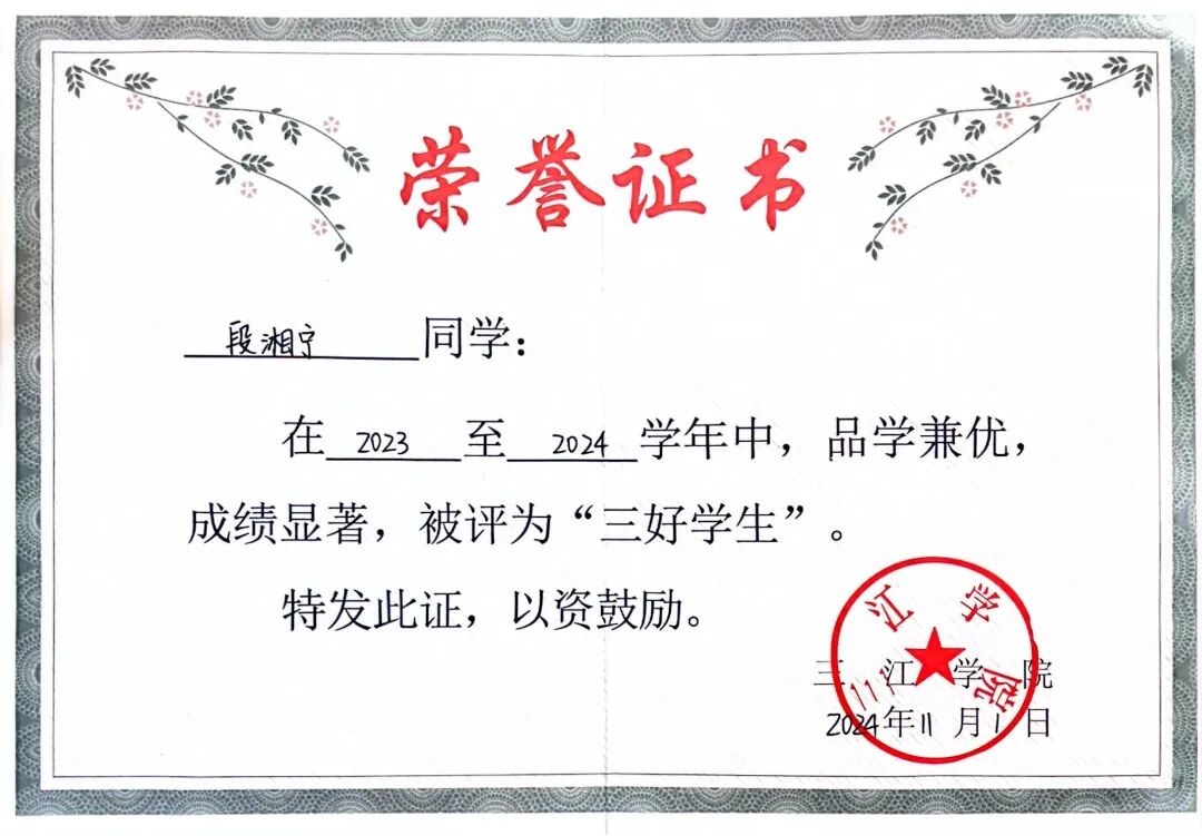 此外,段湘宁祝愿三江的学弟学妹们都能树立自己的理想和目标,向着目标踏实前进,不畏惧失败,实现自己的人生理想。获得国奖后,她仍在前行,短暂的喜悦后,是更加坚定地走接下来的路——考研,她希望通过研究生这样一个更广阔的平台,在建筑行业继续深造,不断提高建筑素养。相信段湘宁付出的每份努力都会得到振聋发聩的回响!