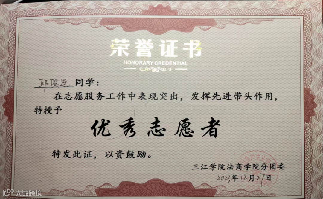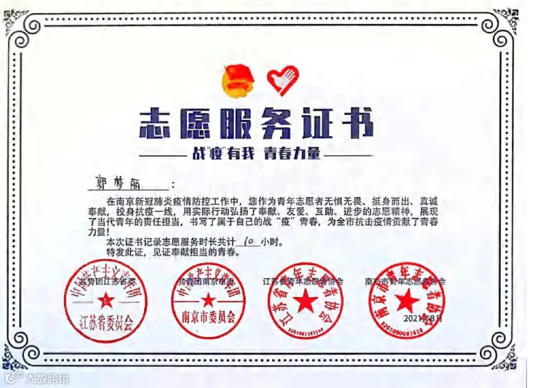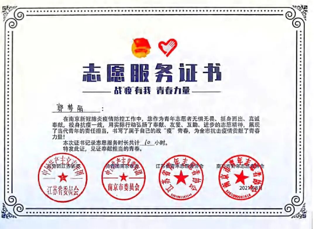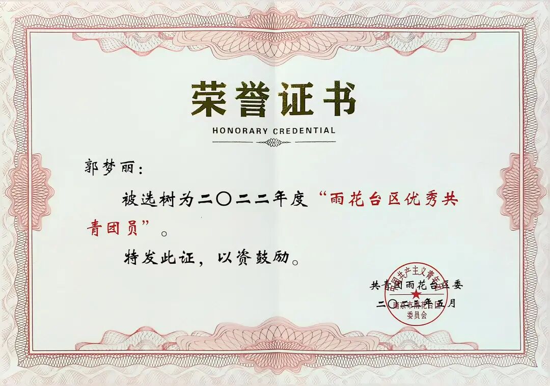 “奉献、友爱、互助、进步”始终是她内心的首要八字箴言。在校外,她担任南京雨薇青年公益服务中心站点经理。郭梦丽自初中起便积极参与各类志愿服务,先后在南京爱之源公益服务组织、雨薇公益等多个组织的带领下为社会提供志愿服务。无论酷暑与严寒,在国展中心,南京站,南京南站青年志愿者服务中心、南京图书馆等地点,总能看到她的身影,累计志愿服务时长500小时以上。志愿服务不仅丰盈了她的内心,也让需要帮助的人看见光!