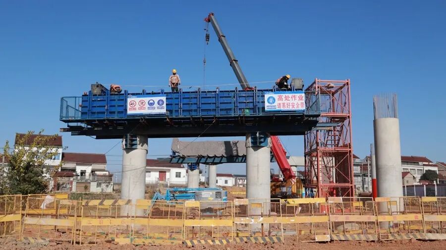 初冬时节,在G4231宁九高速安望段三标段武昌湖特大桥施工现场,打桩机林立,机械轰鸣,工人们忙着捆扎盖梁钢筋,为下一步的模板浇筑工序做好准备。