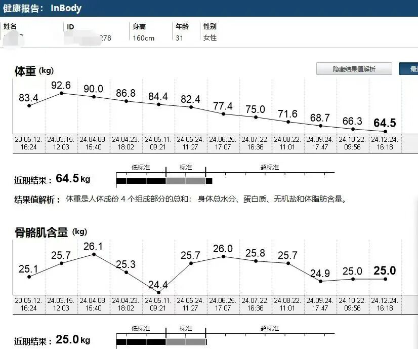 2024年3月,孙女士到广中医营养科就诊,此时其体重已达92.6公斤。接诊后,江涛为孙女士量身定制了一整套减脂方案,采用饮食指导、运动指导、中药内服,以及针灸、埋线等中医外用疗法进行综合治疗和调理。20天后,孙女士体重下降2.6公斤,两个月后减重10.2公斤。到2024年底整个疗程结束时,孙女士体重减至64.5公斤,身体机能逐渐恢复正常。整个过程中,孙女士的体重、体质指数、骨骼肌含量、体脂肪含量及体脂百分比,均达到了科学减肥的效果。