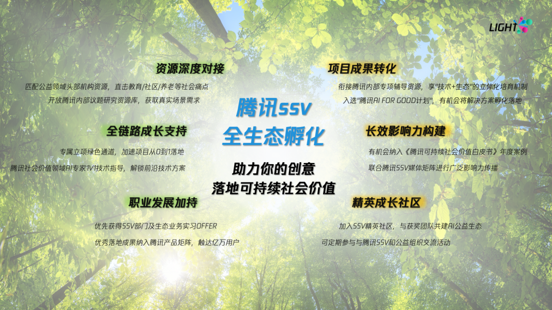 2025 Light创造营由腾讯公益慈善基金会、厦门大学教育发展基金会主办,腾讯SSV、厦门大学人工智能研究院、腾讯优图实验室、腾讯云智能联合承办,腾讯科技特别支持,旨在连接更多元的力量,将AI技术应用到更多解决社会问题、创造社会价值的场景中。
