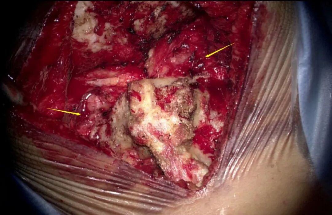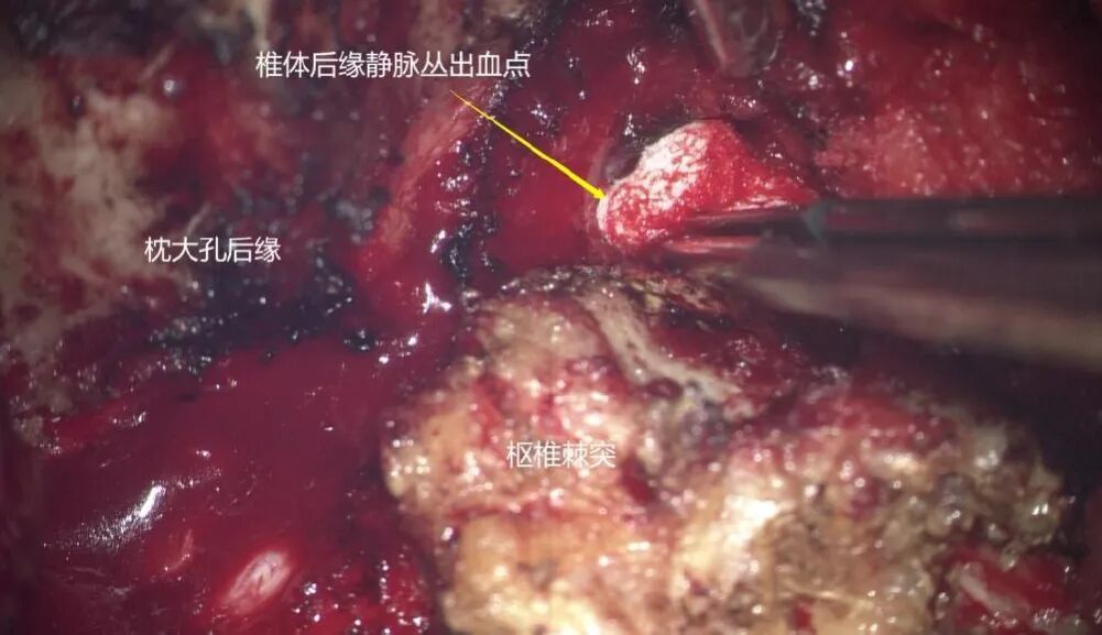 在颈2神经根和椎动脉周围有发达的静脉丛,这些静脉丛与椎管内的静脉丛相互交通,在进行关节间撑开过程中,静脉丛撕裂,出血常常非常凶猛,导致术野模糊,手术操作难以进行,增加神经损伤、置钉失误等并发症的发生。这些静脉丛只有菲薄的管壁,缺乏肌层和弹力层,管径宽大,而且由于静脉丛贴近骨面,很难用双极电凝闭合静脉丛破裂口。