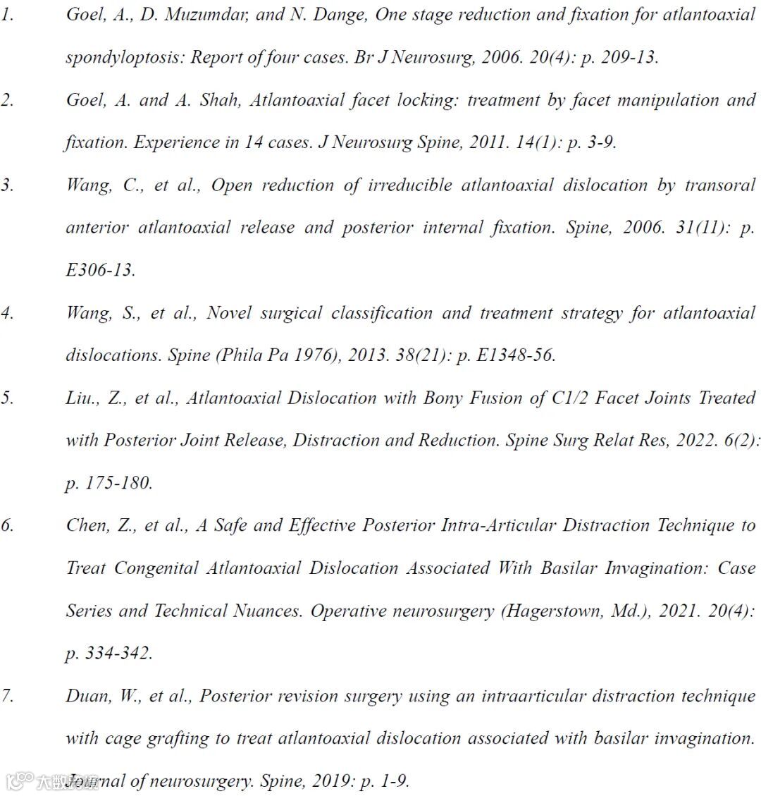 寰枢椎脱位的治疗经历了从后路减压,前路减压,最终到复位融合的漫长演化过程,复位融合技术又可以分为后路松解复位融合技术,前路松解+后路复位融合技术,前路松解复位融合技术等,各种技术各有优缺点。寰枢椎脱位病因各异,病理解剖复杂,目前尚无一种技术可以彻底治愈所有寰枢椎脱位患者。