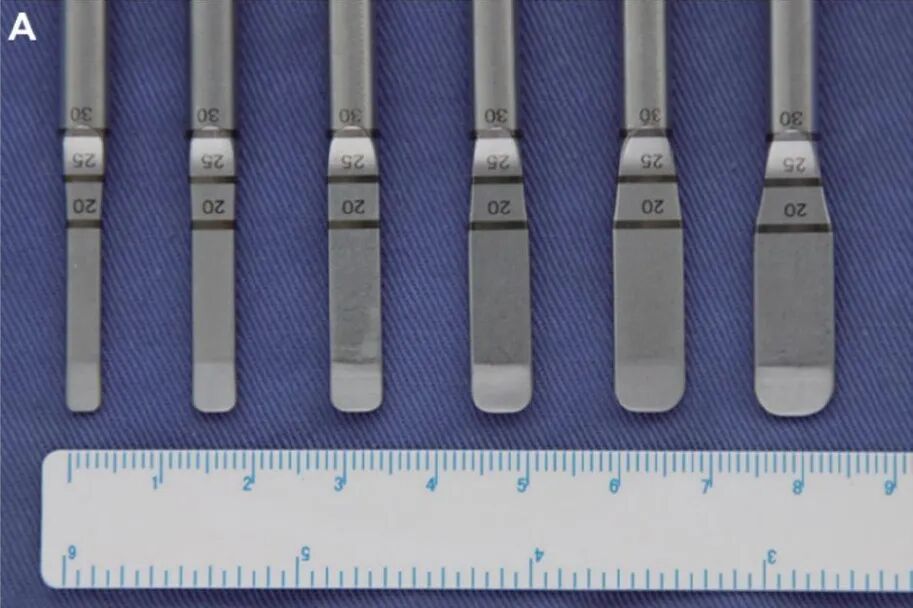 将不同宽度(4mm-9mm)的关节间撑开器(图5),按着从窄到宽的顺序逐级插入关节间隙,撑开器完全插入关节间隙后,其头端可以穿过寰枢椎关节突前方关节囊,到达颈长肌。可以采用撬拨和旋转两种方式对关节进行松解。关节间撑开过程应循序渐进,不可用力过大,可能造成关节面骨折塌陷,而导致手术难以继续进行。