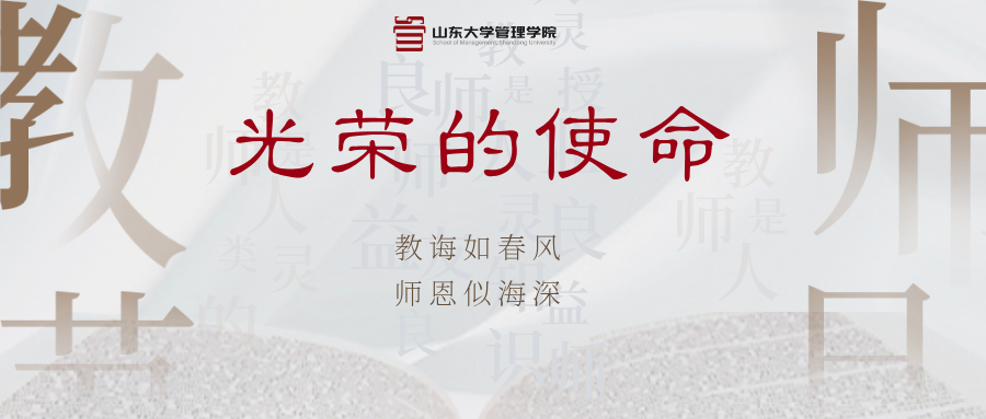 为庆祝第41个教师节,大力弘扬教育家精神,加强新时代高水平教师队伍建设,进一步营造尊师重教良好氛围,学院连续第四年打造“光荣的使命”师德师风建设月主题活动,通过对话学院本年度“最美奋斗者”“优秀教师”“优秀青年教师”“先进教育工作者”与“先进集体”,用镜头记录教育人生,致敬“学为人师、行为世范”的教育情怀。管院人将继续以“弘扬高尚师德,潜心立德树人”为根本任务,牢记“国之大者”,赓续为国育贤百廿初心,在干字当头、全面图强的山东大学新征程中勇担培育时代新人的历史使命,为建设担当中华民族复兴大任的世界一流大学贡献管院力量!