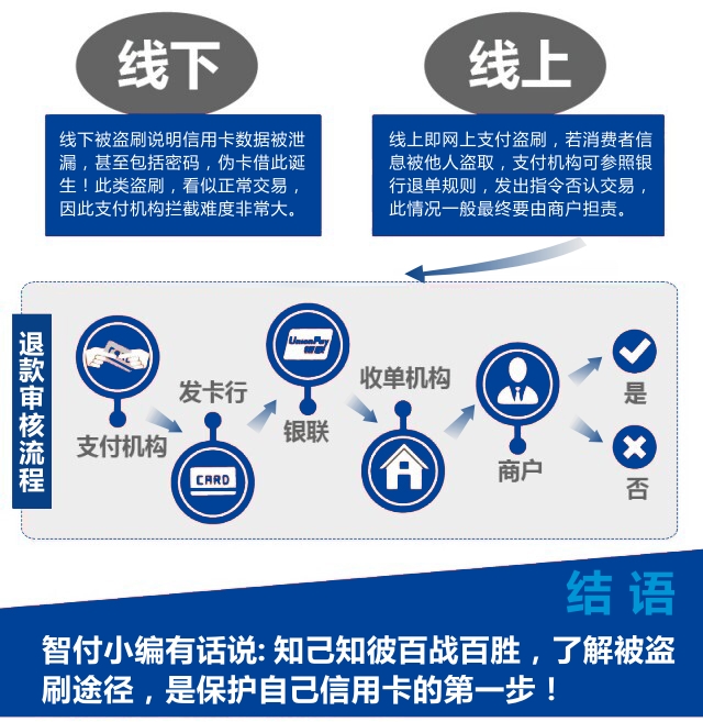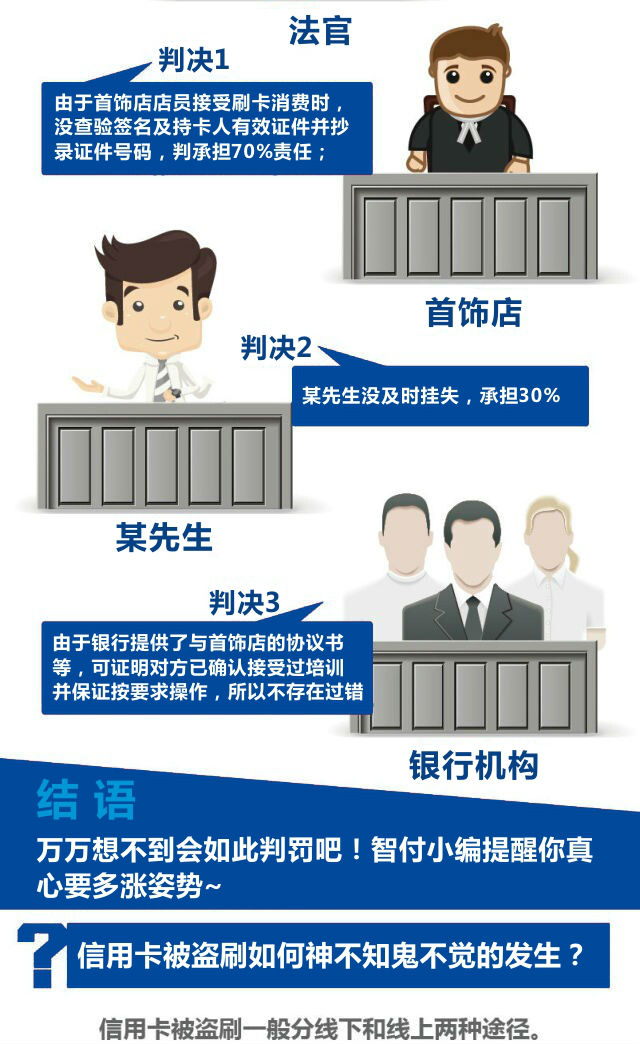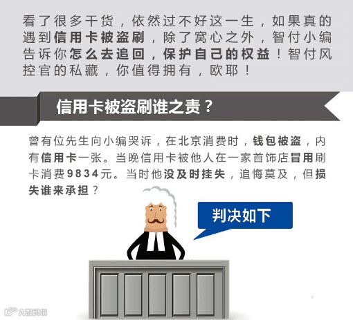 生活中总有些戴着学识高帽的砖家,他们通常习惯了在理论里“穿越翻滚”,对常识却是个不折不扣的“矮子”,学了一车的36计,还是没能抵住信用卡的盗刷,那该肿么办?还好有智付小编准备的信用卡盗刷之追责“三大拷问“,在盗刷之后还能有挽回之策!请参考下图拆招: