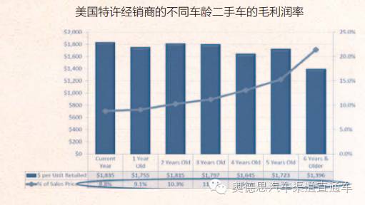 2015年美国特许经销商的二手车单车毛利润为$2355,毛利润率为12.2%,而新车的单车毛利润为$1181,毛利润率只有3.2%,另外,与新车相比,二手车的利润空间更大。另外,美国特许经销商的二手车毛利润率会随着车龄的增加而增加,二手车业务也越来越得到美国经销商的重视。