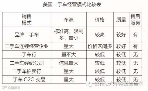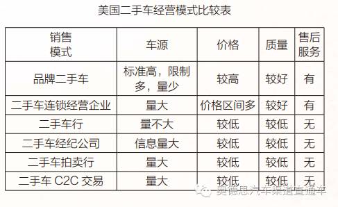美国二手车的经营模式较多,其中最主要的模式包括了二手车的独立经销商模式、品牌二手车经销模式、二手车拍卖模式、二手车个人直接交易模式(C2C)交易模式等等。