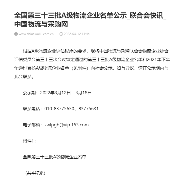 导读:2022年3月12日,中国物流与采购联合会物流企业综合评估委员会第三十三次会议审定通过的第三十三批A级物流企