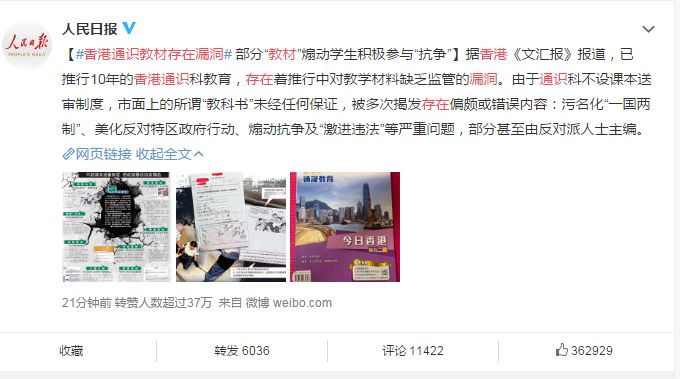 8月22日,人民日报APP发文《香港“通识教材”里,夹了这些私货!》直指香港教育存在的问题。