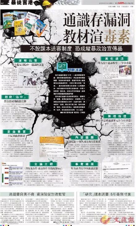 香港高中通识科推行10年,却不设课本送审制度,多次被批刊印偏颇或错误内容。更有专家认为,反对派绑架“通识教育”是制造“废青”的罪魁祸首。港媒举例指出,学校“通识教育”存在漏洞,教材渲染“毒素”,涉嫌灌输仇警、鼓吹“占中”、歪曲事实、立论主观、美化违法等问题,恐成“政治宣传品”。