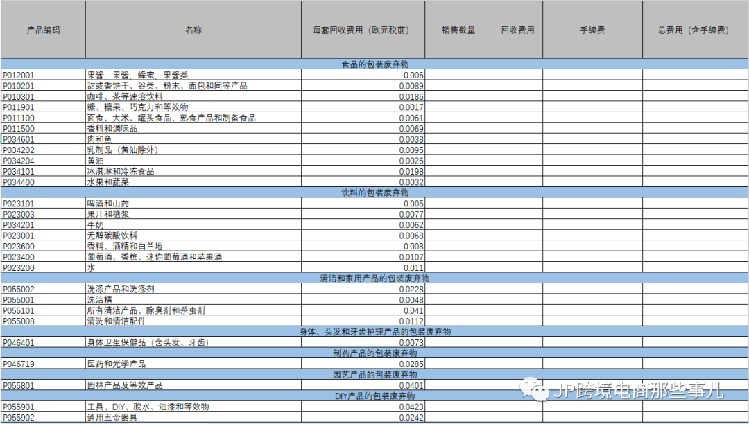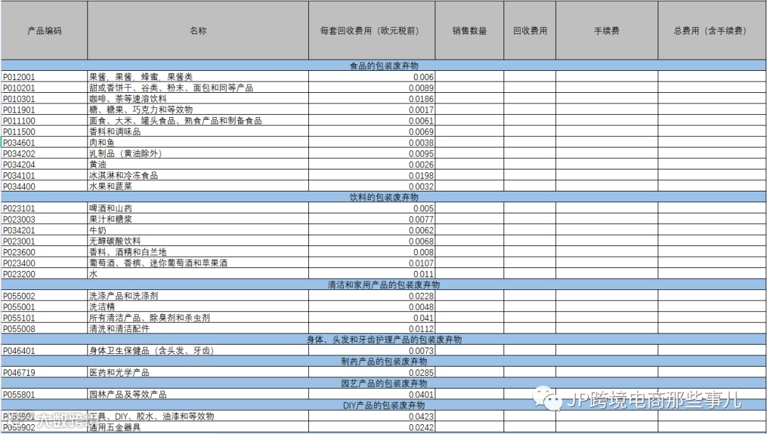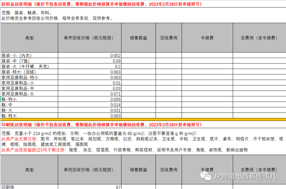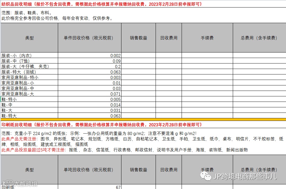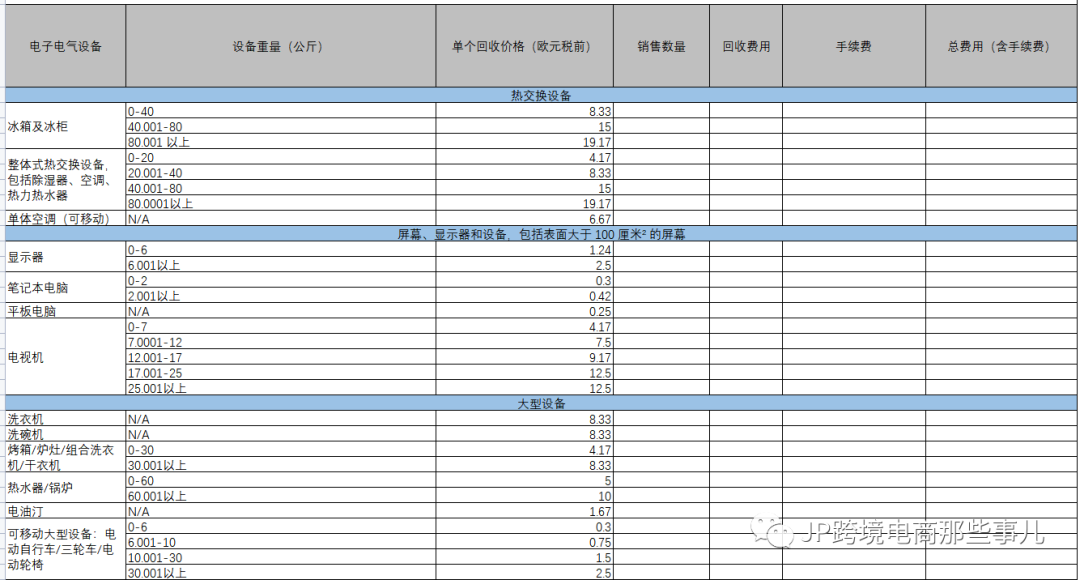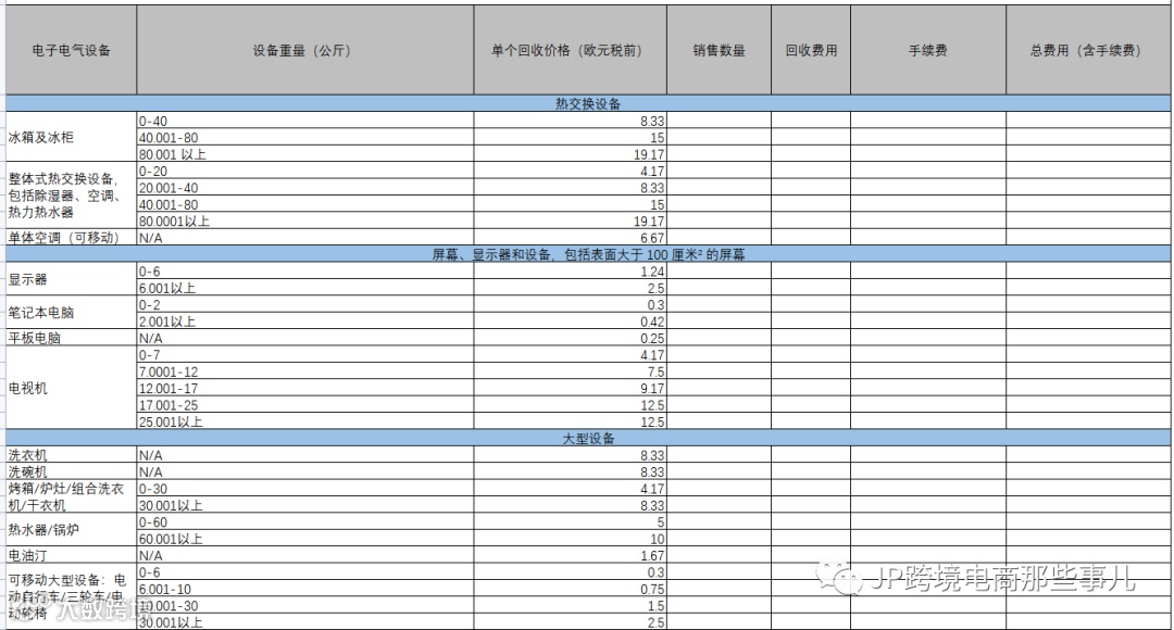02 针对不含有基础申报的注册,这时候就需要了解各项不同类目的回收收费细则了,这里我们为大家整理了一个回收费用的表格:(以法国为例,价格参考当地回收公司价格,每年会有一些波动)