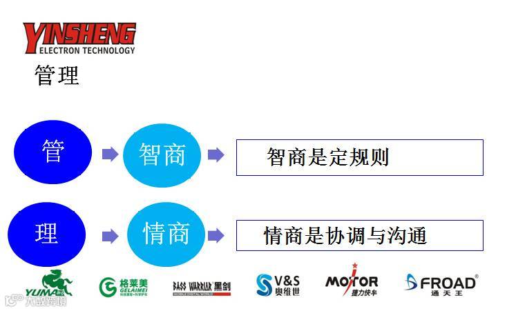 管是智商,理是情商。智商是定规则,情商是协调与沟通。所以管理是智商加情商。有的人智商很高,情商很低。所以管理起来很痛苦,他认为我用权威来管,这是错的!管理者先管自己,管好自己才能形成影响力,才能形成员工对你的尊敬,才能形成员工对你的敬畏,才能更有效的管理下属。这两年,我每天7点钟左右起床跑步,我发现我的员工很多被我同化了,特别是零售的团队,很多6点钟起来跑步,然后冲凉,吃早饭,9点上班。我觉得凡是把生活做得有规律的员工我们成本很低,因为大家的价值观很靠近。