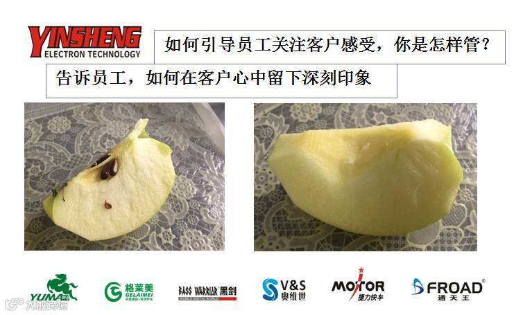 对细节不坚持操作的员工,我是这样管,我会告诉他如果工作只流于形式,不做好过程,如何能让客户产生共鸣?服务是情感的交流,缺少情感的交流,你的服务还有什么意义?所以我们很多的服务过程是很有价值的。因为我们没有情感的交流,明明很好的转化我们没有做好。我去一个店,老板热情,一个苹果切成四块,拿到手里无从入口,也削皮了。但是他没有想过我的感受,他只是把表面热情做好,但是细节没有做好。通过苹果的故事,左图你只是考虑苹果切开,但是没有考虑到客户的感受,有没有考虑到切块大小,有没有对方容易不容易拿,容易不容易入口。你别看小的生活上细节。教育是最管用的。