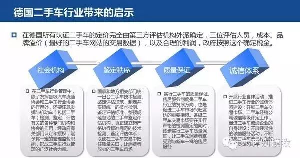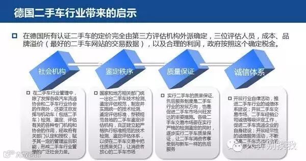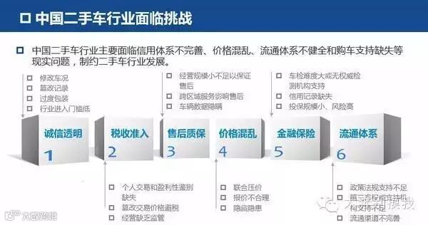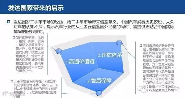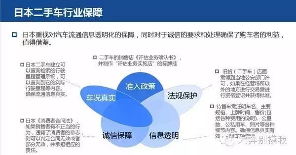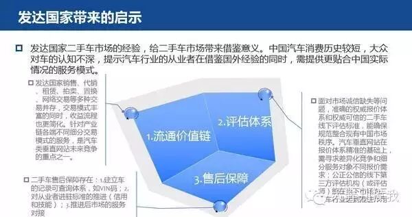 发达国家有近100年的汽车历史(至少也是50年),相关的政策、产业和价值链都相对成熟,民众对车的认知更是深刻,就如同我们认知电视机,自行车一样;发达国家有良好的个人、渠道商和车辆信用记录系统,通过记录系统可以将车辆的信息透明公开,将交易双方的信用信息公开,所以二手车的交易简单、快捷、便利、真实。中国汽车由奢侈品转换到家用消费品也不过10年的时间百姓对于车辆的认知和信用体系未成熟,滋生了很多乱象,这很正常,日本、德国早期二手车交易也出现过混乱的历史,后来都是依靠第三方机构推动二手车行业发展,逐渐的渡过了灰暗的时段。所以目前出现的行业乱象属正常,根据行业的发展会过去的。其中最主要的还是民众对汽车的认知、第三方权威机构确立和信息化数据渠道的建设帮助。