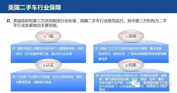 1, 品牌经销商,他们也都同时经营着新车和二手车,二手车车源状况好,信誉度高,价格也相对较高,美国汽车经销商30%的利润来自于二手车,近年来,认证二手车销量上升趋势明显。经销商联合金融机构、保险公司和延保服务提供商等。经销商、厂家等积极参与相关制度的建立和完善,对推动美国二手车市场的健康发展起到了非常重要的作用,独立的第三方评估机构也在二手车发展过程中应运而生。经销商的行业交易量大概占到60%;