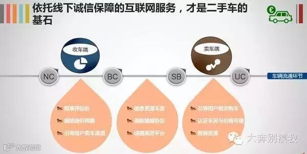 为什么一定要依托诚信的线下保障呢?车辆作为高价值物品,是区别于传统电商产品,而大多数购买者并不是非常了解二手车的交易,所以基本去了各地的交易市场,车贩子花招层出不穷,就像绵羊一样被宰割或者干脆拒绝购买二手车,这也算阻碍二手车交易中的一个主要因素。另外二手车带有他本身的特性,不同的年限“一车一况,一车一价”,简单的做个比较,新车同样年款的车型,你出售的时间不同,得到的报价不同,同样的车型,同样的年限,你保养的很好或者你剐蹭过车漆,出售的价格又不同;还有呢,你一辆车,卖给贩子,获得不同的价格,你在卖给另外的个人,又获得不同的价格……上述说的也只是关于评估和价格端的,关于实际交易端和过户端有更多的道道(这里真有必要去写篇文章来揭示二手车交易的黑幕),这样复杂的情况,我们怎么去通过线上拍几张照片,留几句言实现相互间几万甚至,十几万的交易呢?不管在线上怎么进行推广,真正实际的交易还是需要线下解决,而十几年来真正控制线下交易的就是我们所谓的车贩子。所以,基本上各大二手车服务商近几年和未来几年干的事有这么几件:1,建立平台,拓展服务,推广车源;2,数据产品,精准营销;3,线下交易,诚信经营。然后这场战争很明显了,一群对实际战场缺乏控制力的英豪,希望能通过规范市场,信息服务,平台吸引来实现革命,还有一些英豪,甚至自己参与战争,抢了贩子们的生意。这场战争,结果应该是非常容易判断的,正如我们今天看到的发达国家的二手车交易链条一样,行业必将走入正轨:诚信服务,透明车况,合理价格,保障售后。那么,问题来了,这场战争该怎么打?谁会胜出?未来是怎样的格局?