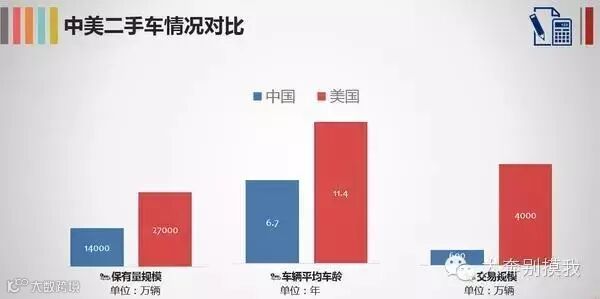 2013年中国的新车交易量2100万辆,美国的新车销量1560万辆,中国的新车销量已经超越美国,而车辆的平均年龄中国仅有6.7年,中国二手车的交易量仅占到美国的七分之一,随着保有量的增加和车辆年限的延长,加上成熟的市场服务,二手车的交易量也将迎来喷井式的爆发。