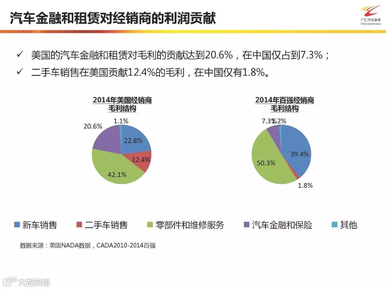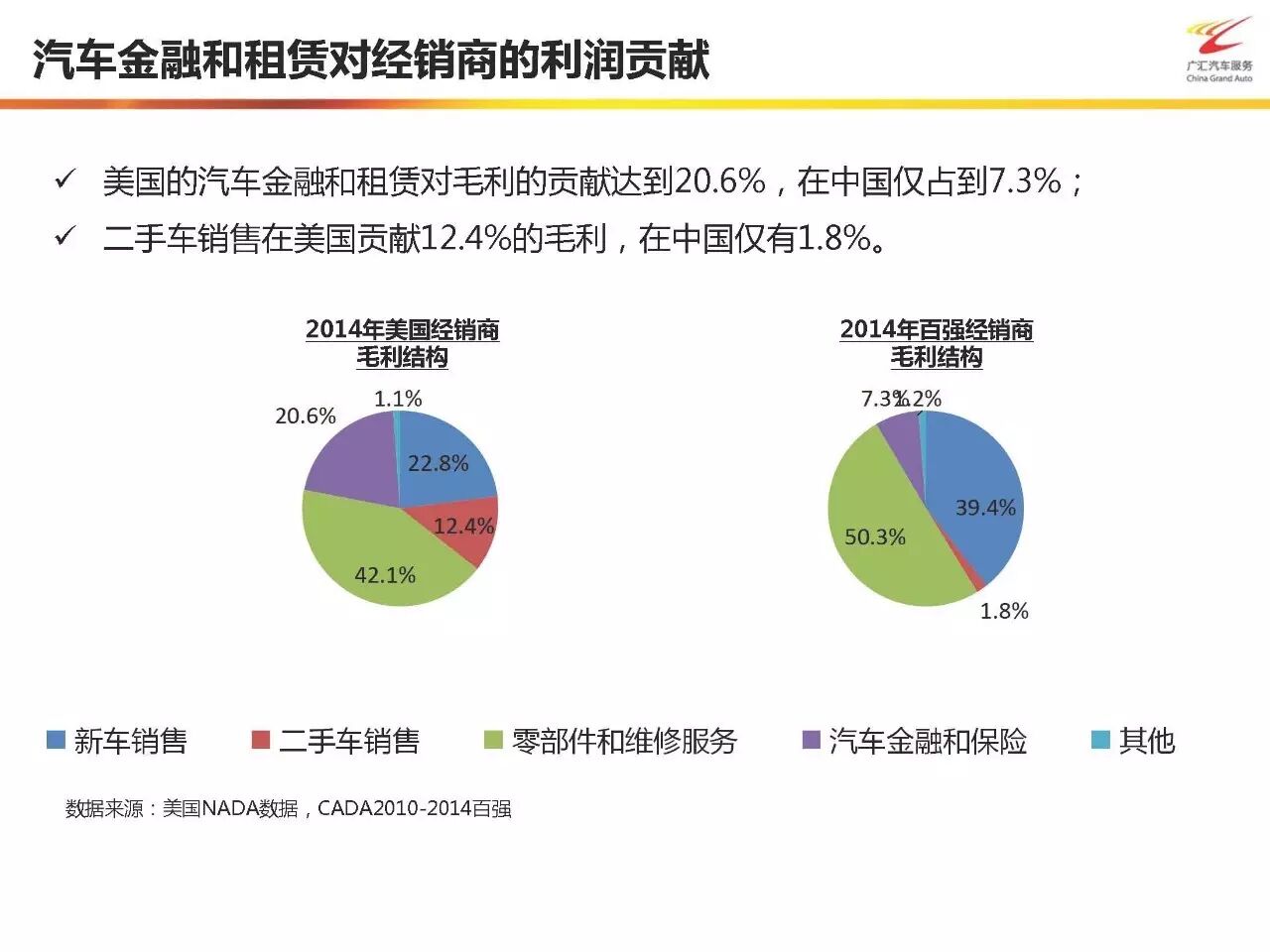 从上图中可以看到汽车金融和融资租赁对经销商的利润贡献。2014年美国经销商的毛利结构和国内百强经销商的毛利结构有几个典型的特征:一是美国的经销商汽车金融、资租赁业务的毛利贡献占到经销商20.6%。中国的百强经销商汽车金融和融资租赁业务的毛利贡献仅占到7.3%。因此越来越多的国内经销商集团都在布局自己的融资租赁业务。到目前来讲,国内的经销商集团应该已经超过78家。二手车销售在美国占到经销商12.4%的毛利贡献,但在国内只有1.8%。这同样可以说明融资租赁对未来经销商的发展潜力巨大。