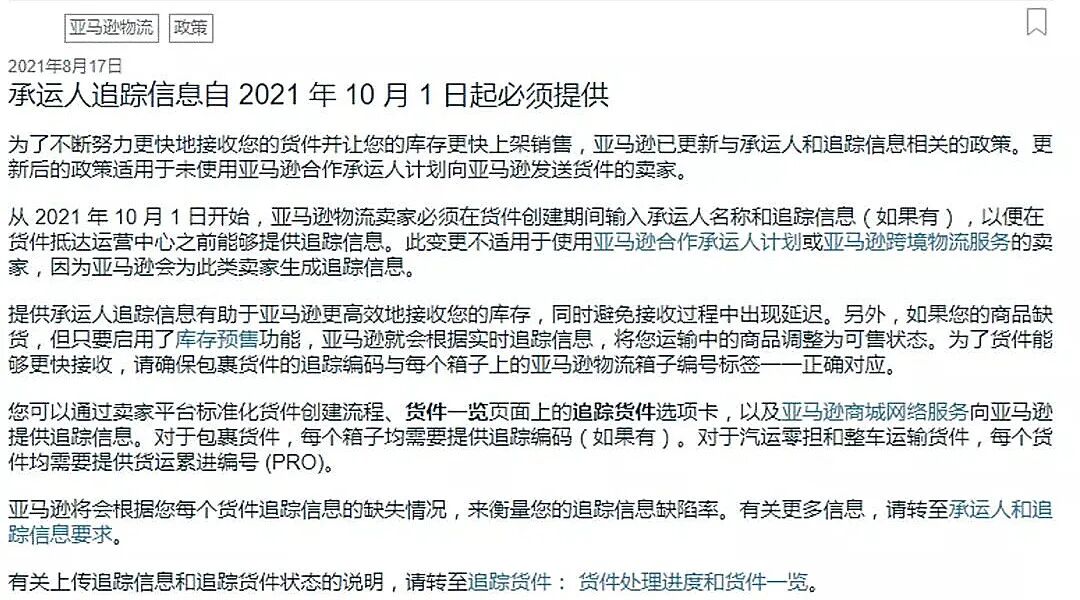 事实上,这则消息与此前亚马逊物流FBA发布的“承运人追踪信息自2021年10月1日起必须提供”十分相似。