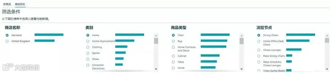 如果卖家想要了解更多潜力的类目信息,通过“高级研究”功能即可实现。说白了,高级研究功能是提供买家消费偏好特点,具体到不同产品性能、功能需求与竞争情况,给卖家提供更多新品类的开拓机会。