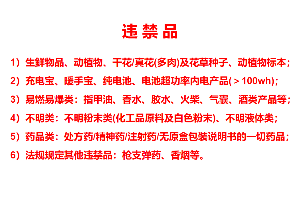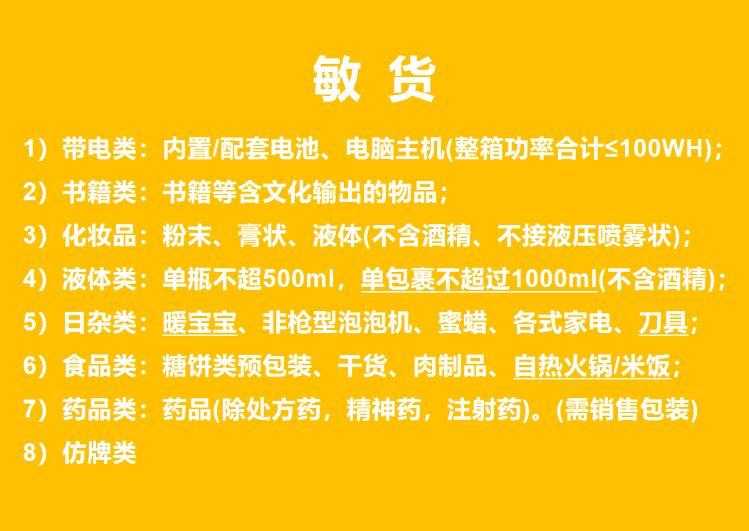 · 特点:可能含电池、磁性、液体、粉末、食品、药品、化妆品、品牌物品等。
