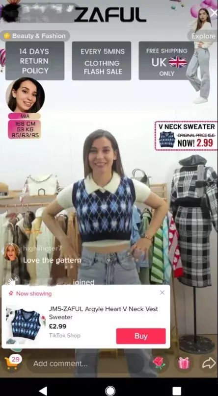 买家直播界面类似平时用户刷TikTok视频界面,不过屏幕下部出现滚动评论,在最下方有小黄车、留言区、鲜花、礼物以及分享等功能。