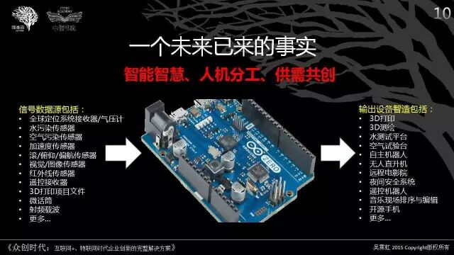 例如, 今天,据公开报道,如果战争爆发,美国军队可以不用从制造商那里订购急需的配件了,大型航母可以用海水处理、废水脱盐,提取所有的化学和金属元素,然后将它们输入到特殊3D打印机,就可以即时生产导弹、飞机、步枪,甚至可以更换皮肤和制造食物。曾经是科学家们想象的这个3D打印场景,因为有了智能智慧、人机分工、以及供需共创的模式而成为现实。