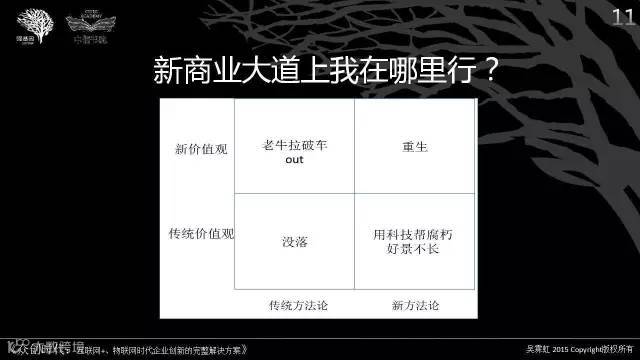 我将价值观和方法论两个重要维度组成这个图,大家可以试试标注自己的位置,新商业大道上,我在哪里行?