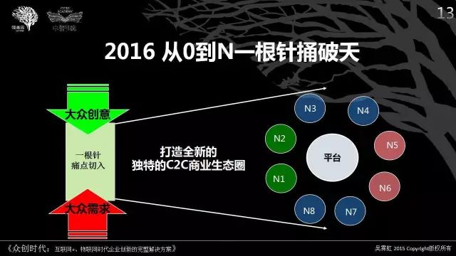 今年春天,Peter Thiel问我的《众创时代》与他的《从0到1》最重要的区别是什么?我说,你讲的“从0到1”是要创业者在某个领域建立垄断地位,而我研究的是“从0到N”,要创业者以一根针捅破天,建立商业生态圈。